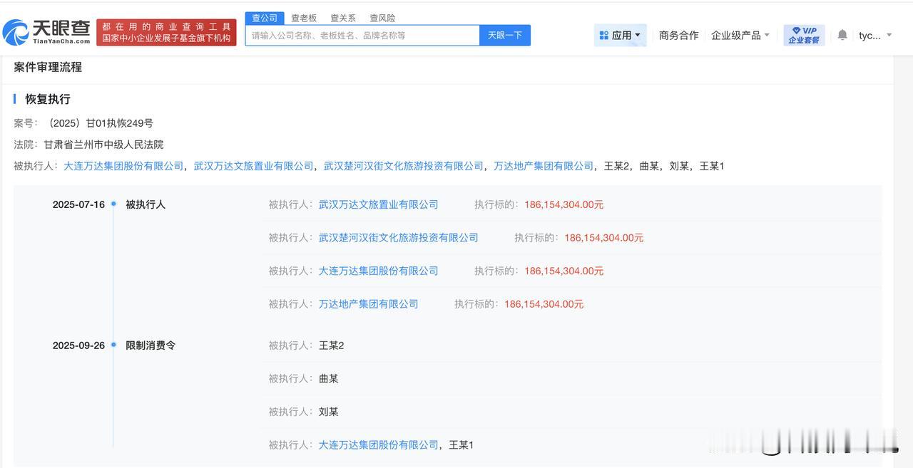 【万达集团及王健林被限消 王健林及万达集团新增限消令】 天眼查App显示,近日。大连万达集团股份有限公司及其法定代表人王健林新增一则限制消费令,执行法院为甘肃省兰州市中级人民法院。案件流程信息显示,今年7月,大连万达集团股份有限公司等已因此案被执行1.86亿余元。 大连万达集团股份有限公司成立于1992年9月,注册资本10亿人民币,经营范围包括货物进出口、技术进出口、国内一般贸易等。股东信息显示,该公司由大连合兴投资有限公司、王健林共同持股。天眼风险信息显示,该公司现存10条被执行人信息,被执行总金额超52亿元,此外,该公司所持多家公司股权已被冻结。 天眼查信息: