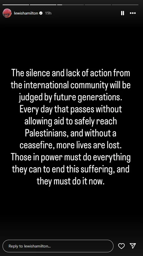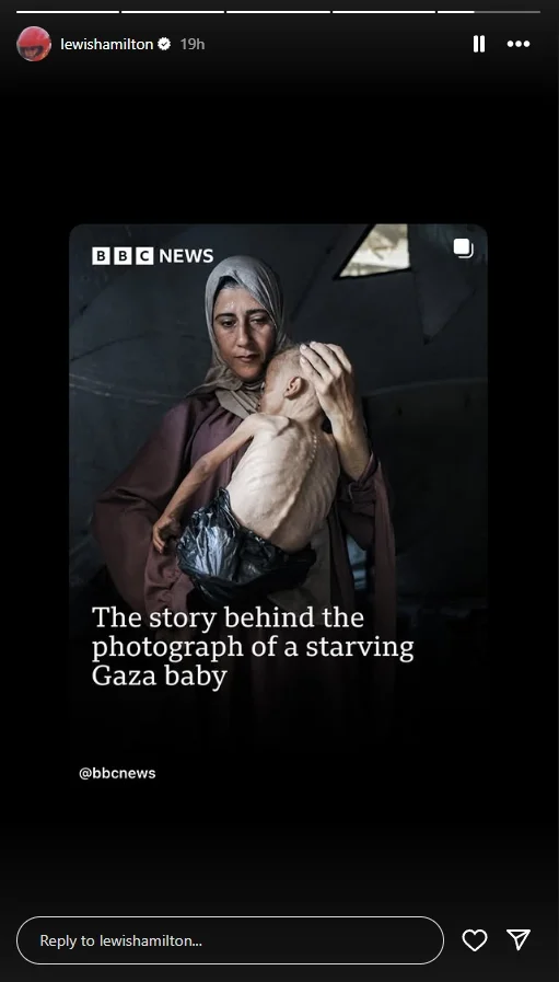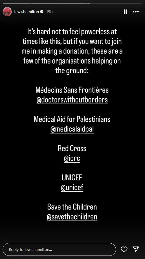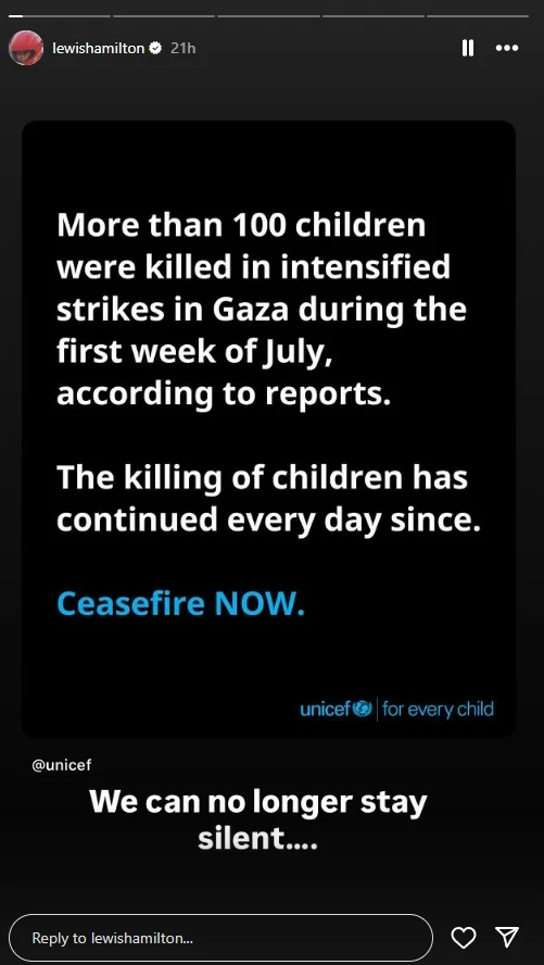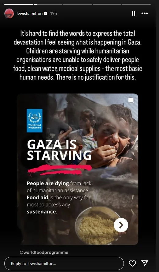 刘易斯·汉密尔顿(Lewis Hamilton)今天在ig上转数条联合国儿童基金会的帖子,怒斥以色列阻止人道主义组织往加沙地区运输资源、呼吁全世界共同关注加沙。
