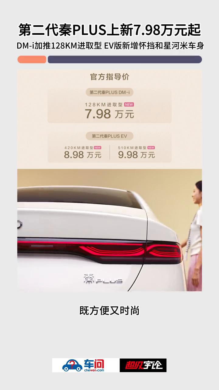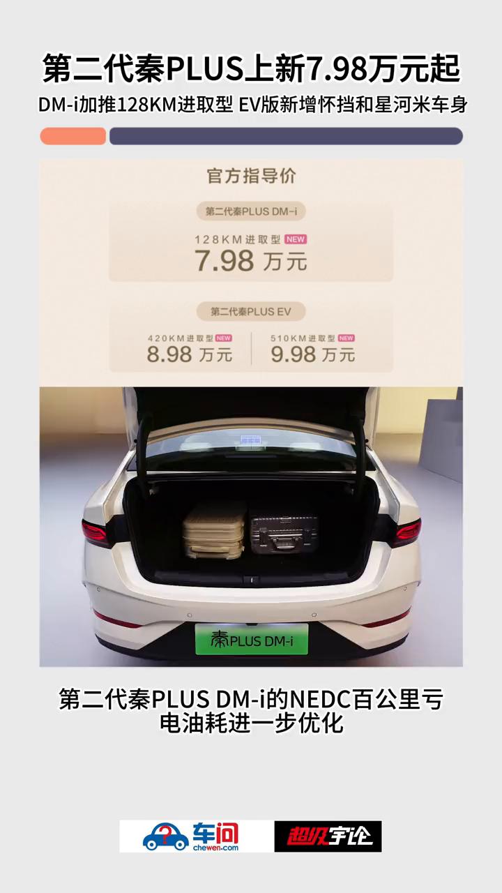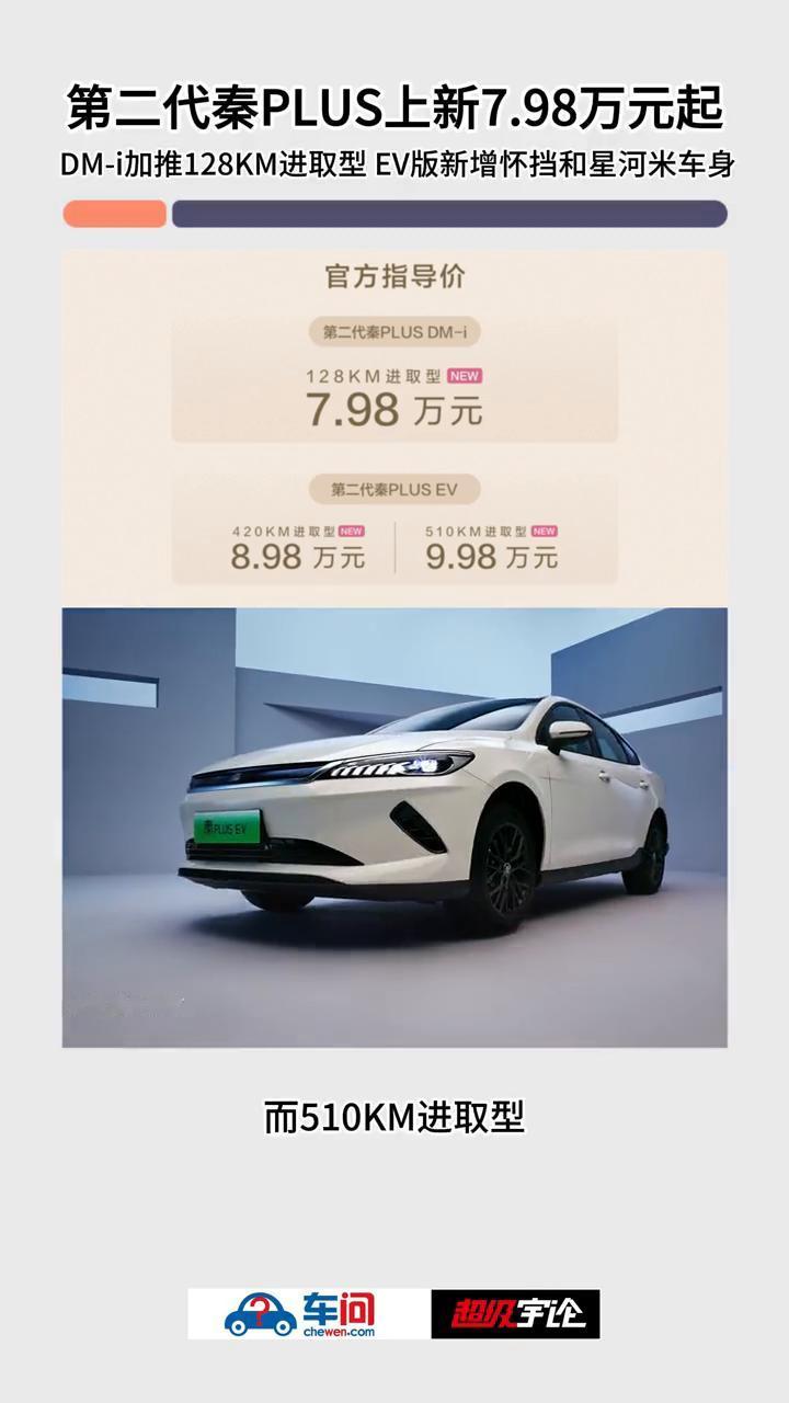 t:第二代秦PLUS上新7.98万元起,DM-i加推128KM进取型EV版,新增怀挡和星河米车身。 车问。 9月25日,比亚迪第二代秦PLUS双车上新,发布了秦PLUS DM-i 128KM进取型、秦PLUS EV420进取型、510KM进取型三款新车。 秦PLUS是目前A级家轿市场的绝对王者,累销超过150万辆,蝉联2023、2024年度家轿销量冠军。而为满足插混用户对纯电长续航的需求,第二代秦PLUS DM-i加推128KM进取型,一次充电就可以满足大部分用户一周通勤的需求。 发布会现场比亚迪官宣:第二代秦PLUS DM-i的NEDC百公里亏电油耗进一步优化,低至2.69L,为用户带来更经济实惠的用车体验。此外,这次加推进取型还上新了怀挡设计,全系新增了星河米车色,既方便又时尚,为用户增加了更多个性化选择。 纯电版方面,420KM进取型是靠谱的"通勤搭子",充一次电够跑大半个月,省去了频繁充电的麻烦。而510KM进取型能拓展车主的生活圈子,而且秦PLUS EV的续航达成率非常高,"刀片电池+八合一电驱总成"组成黄金搭档,再加上宽温域热泵系统,能在零下30°C到零上40°C的温度里工作,大幅提升冬季续航能力。 此外,两款纯电进取型采用前麦弗逊+后多连杆独立悬架,拥有NFC钥匙、车载ETC、智能语音、VTOL移动电站等实用"小神装",让入门车型也能有满满的幸福感! 除上新进取型之外,秦PLUS双车也为老车主带来了福利,上市仅半年时间,第二代秦PLUS已经历多次OTA升级,新增了约20项功能,在辅助驾驶、智能座舱等方面大大提升了用户体验。