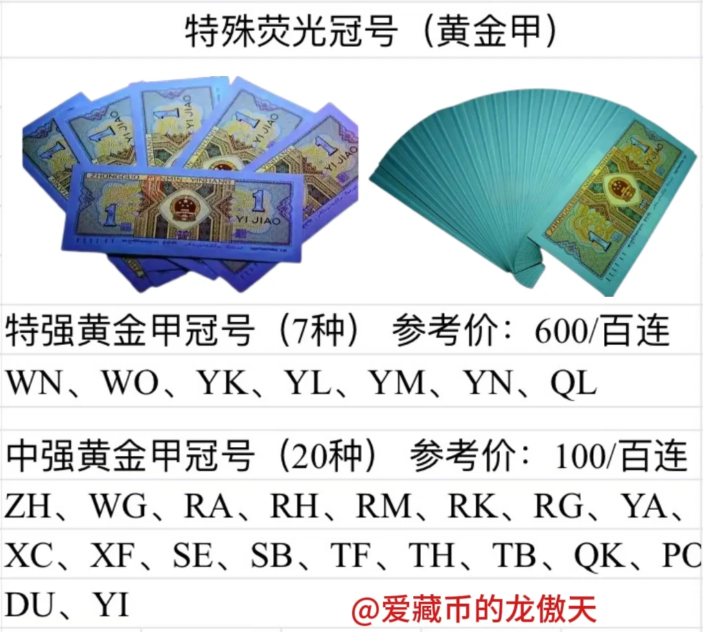 今天继续来讲第四套人民币中的小额纸币的特殊冠号,希望能够帮助到大家。 1980版的一角纸币发行量非常大,有500多个冠号,其中有一些补号以及强荧光号比较稀有,收藏价值比较高,图中已经列出来了。 收藏一般都收藏全新品相的,像那种流通品相的也就面值了,所以大家不要再问了。