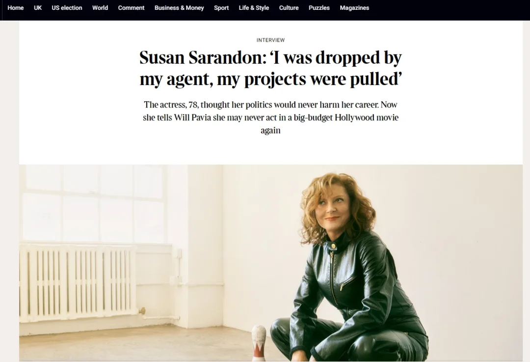 尽管苏珊·萨兰登在她的言论受到批评后发表了道歉声明,但她说,她被人们当作了一个“负面例子”,被用于告诉其他艺人:如果你想继续工作,就不要牵扯这些事。
