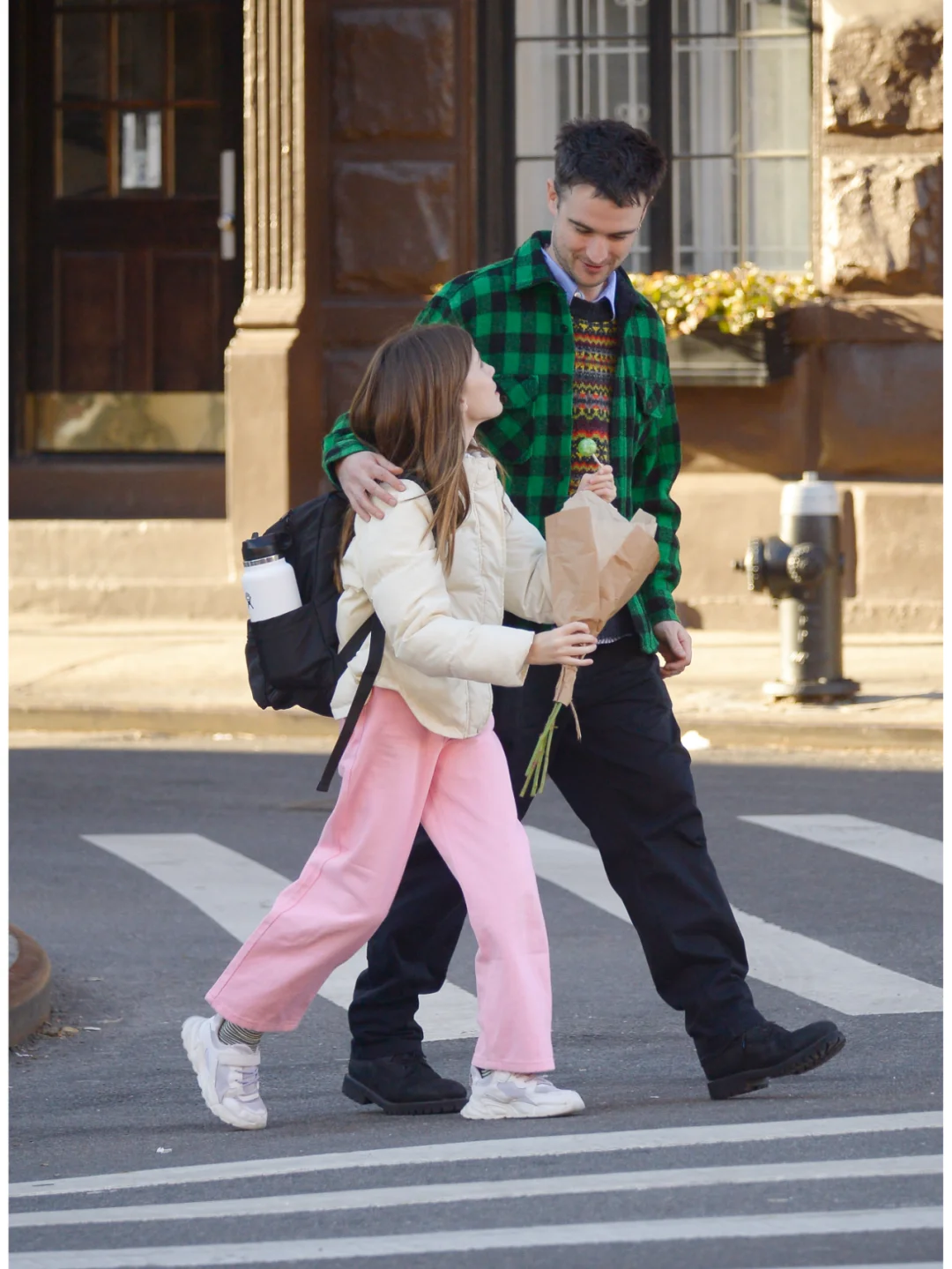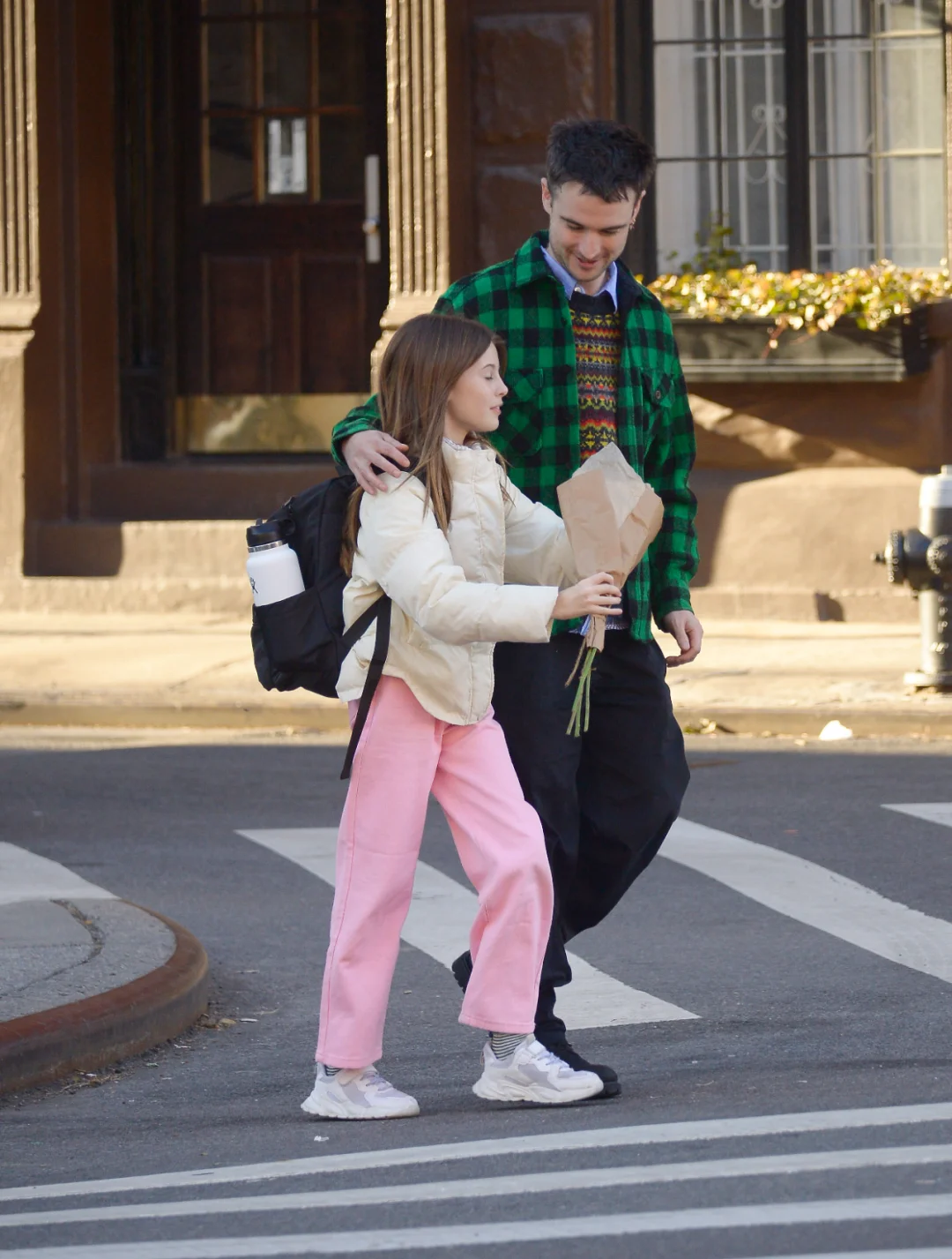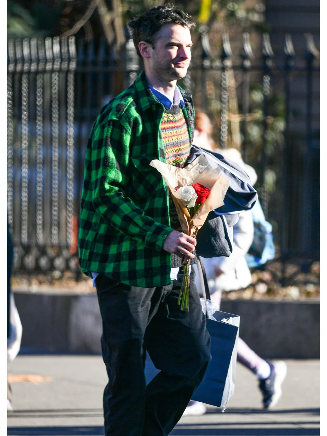 网飞大热剧集《睡魔》主演 Tom Sturridge 当地时间2月14日带女儿 Marlowe Ottoline Layng Sturridge 在纽约出门逛街,Tom Sturridge给女儿带了一束花。