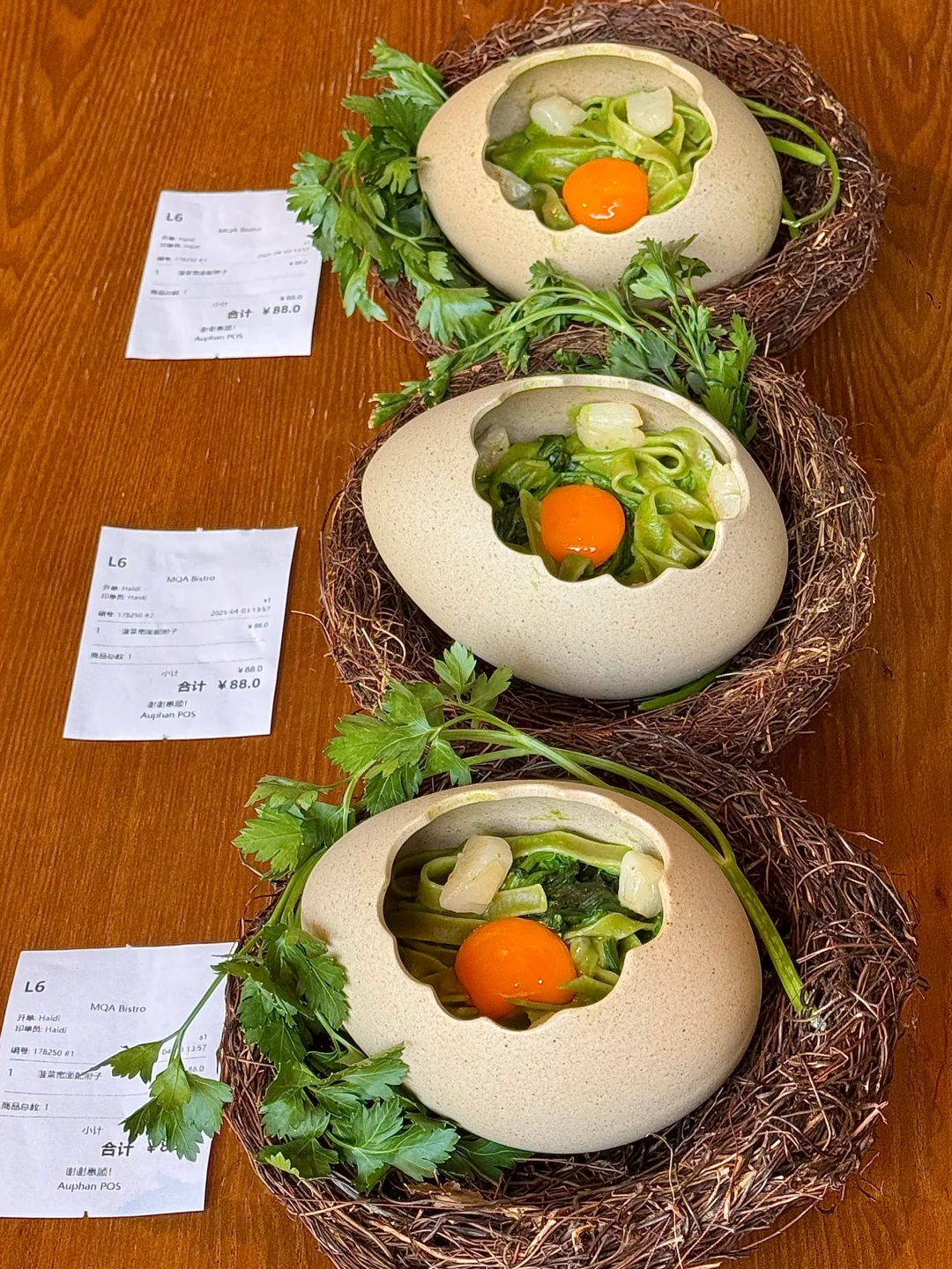 装在鸟巢里的菠菜宽面好有意思!戳开生鸡蛋~每一根宽面都裹满蛋液!嗦得停不下来🤤