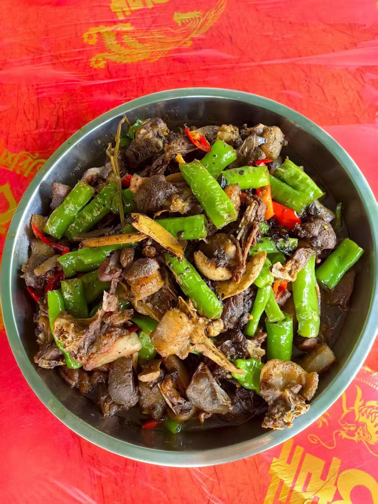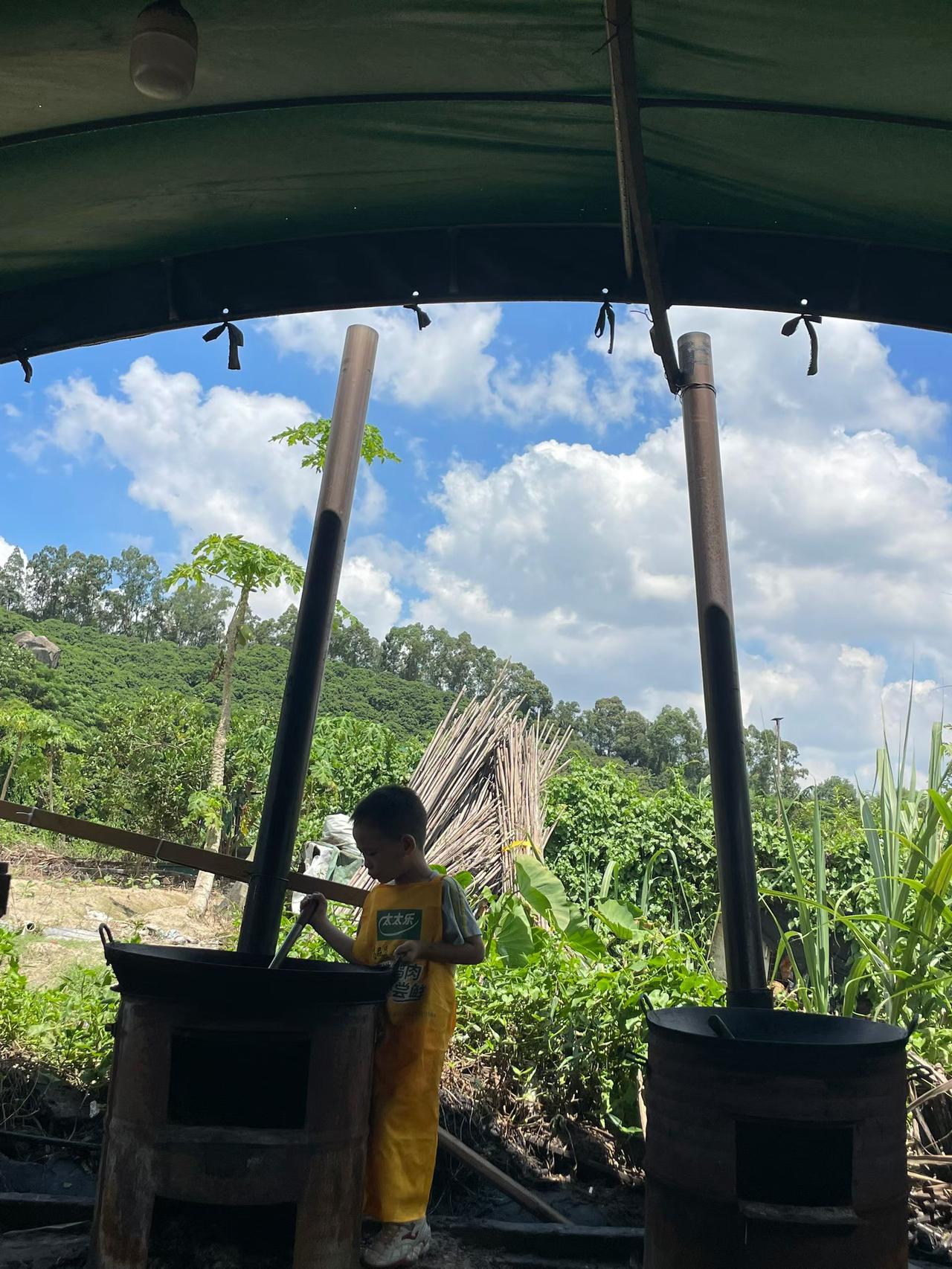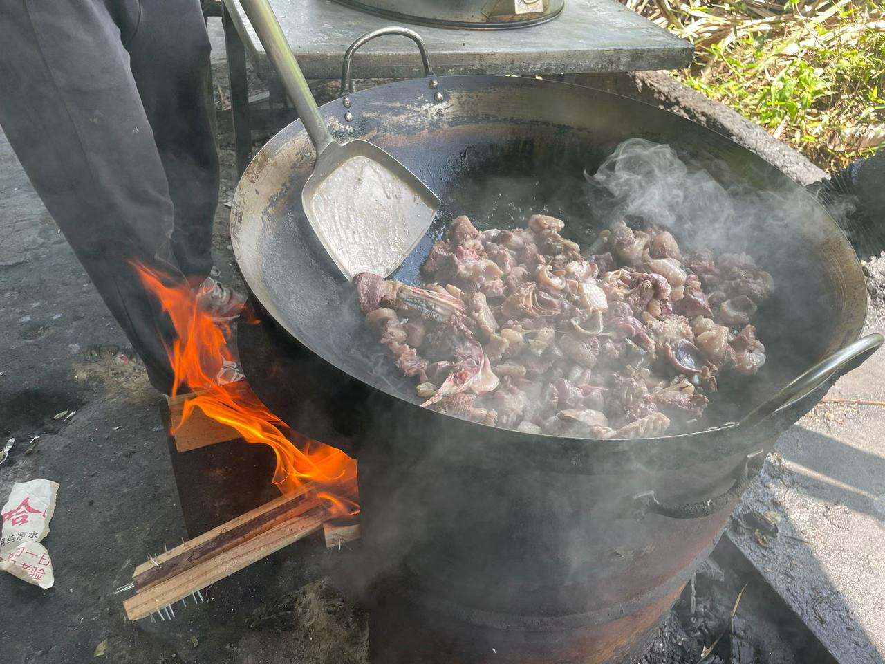 周六带娃踢球爬完福永凤凰山,和邻居也是孩子同学两家人直接骑着电动车来到附近绿道旁的农家乐,自从发现了这里可以自摘蔬菜现场宰鸡鸭鹅肉后自己烧柴火大锅炖煮后,两年来了快有10次,而且介绍了很多邻居过来都说很棒。今天提前找老板娘订了一只鹅,足有十斤重,我们到了的时候已经在拔毛了。这个季节没什么成熟的瓜果,就只有红薯叶,搞了一两斤。老板娘帮忙剁好肉后,几个大人轮番上阵烧火烹制,做成了辣和不辣两大盘,小朋友则在一边玩泥巴,看到要烧火了马上过来帮忙洗锅拾柴,大中午这么热只有我们这一桌,相当于包场了。相比起去大商场吹着空调排队吃预制菜,我们更愿意来山边自己动手吃上新鲜肉菜,大人小朋友都吃得很开心,打包回去还能吃两顿[呲牙]