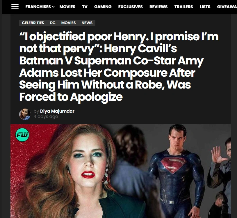 在扎克·施奈德导演的《蝙蝠侠大战超人》中,艾米·亚当斯在片场不小心看到只穿了长袍的亨利。不曾想,这次“瞥见”就一发不可能收拾!那让人着迷的肉体使得艾米在后面拍摄间隙里不断偷偷窥视亨利的俏丽胴体。