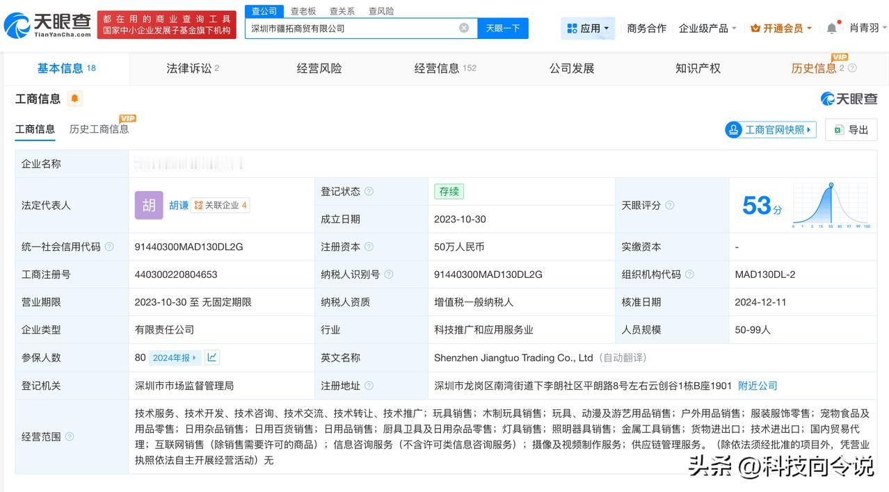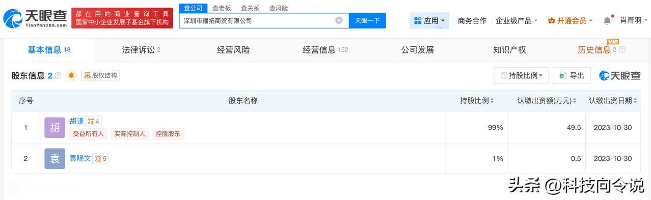 【取消额外假公司2023年0人参保 取消额外假公司成立不足2年】取消额外假公司已落实正常放假 据媒体报道,近日,深圳市疆拓商贸有限公司因拟安排员工补班并调整年假福利引发网络热议。 天眼查工商信息显示,深圳市疆拓商贸有限公司成立于2023年10月,法定代表人为胡谦,注册资本50万人民币,经营范围包括货物进出口、技术进出口、国内贸易代理、互联网销售等。股东信息显示,该公司由胡谦、袁晓文分别持股99%、1%。年报信息显示,该公司2023年参保人数为0。 天眼查信息: