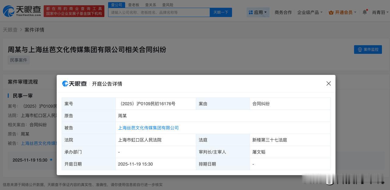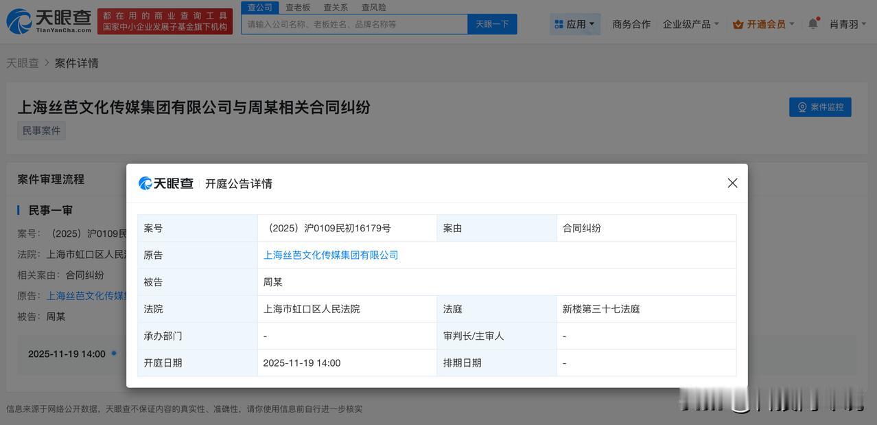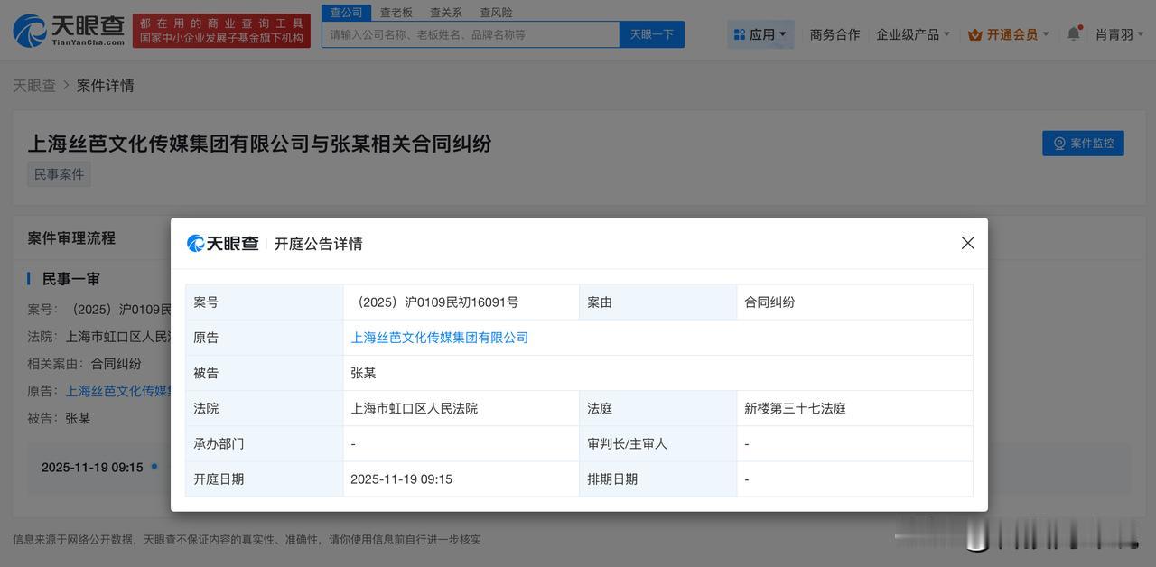 【丝芭传媒起诉解约成员 丝芭传媒新增多起合同纠纷】 天眼查App显示,近日,上海丝芭文化传媒集团有限公司新增三则开庭公告。两则案件原告为上海丝芭文化传媒集团有限公司,被告涉及周诗雨、张润。一则案件原告为周诗雨,被告为上海丝芭文化传媒集团有限公司。上述三起案件案由均为合同纠纷,均将于11月19日在上海市虹口区人民法院开庭审理。 今年6月,SNH48成员周诗雨、GNZ48成员张润曾发长文宣布与丝芭解约。 天眼查信息: