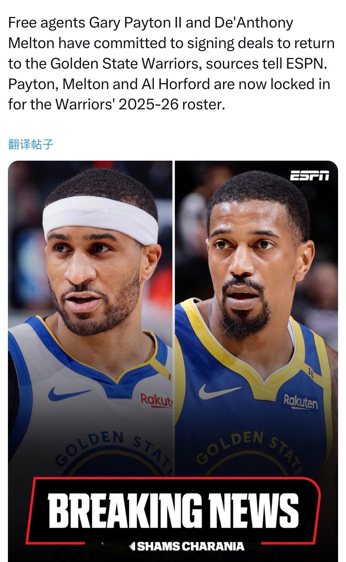 喝传言中的一样,霍福德、佩顿、梅尔顿顺利和勇士签约。