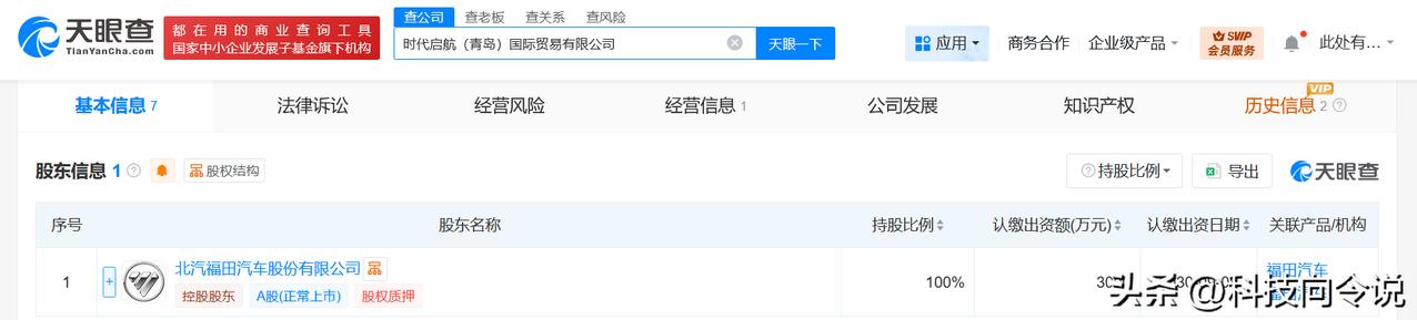 【福田汽车在青岛成立国际贸易公司 注册资本3000万】 天眼查App显示,近日,时代启航(青岛)国际贸易有限公司成立,法定代表人为刘旭光,注册资本3000万人民币,经营范围含技术进出口、汽车销售、二手车交易市场经营、汽车零部件研发、汽车零配件批发、生产性废旧金属回收、有色金属合金销售、企业管理咨询、市场营销策划、信息技术咨询服务等。股东信息显示,该公司由福田汽车(600166)全资持股。 天眼查信息: