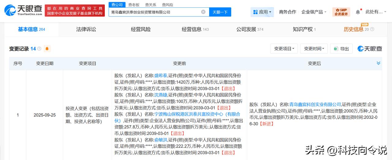 【俞敏洪退出洪泰基金旗下管理公司直接股东】 天眼查工商信息显示,近日,洪泰基金旗下青岛鑫宸洪泰创业投资管理有限公司发生工商变更,盛希泰、俞敏洪、宁波梅山保税港区洪泰共富投资中心(有限合伙)、沈燕婕退出股东行列,新增青岛鑫宸科创实业有限公司为股东并全资持股。 青岛鑫宸洪泰创业投资管理有限公司成立于2020年4月,法定代表人为陈曦,注册资本2000万人民币,经营范围含私募股权投资基金管理、创业投资基金管理服务。 天眼查信息: