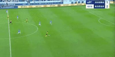 段刘愚撩射稍稍高出横梁。 中超联赛第26轮,深圳新鹏城vs青岛西海岸的比赛进行到