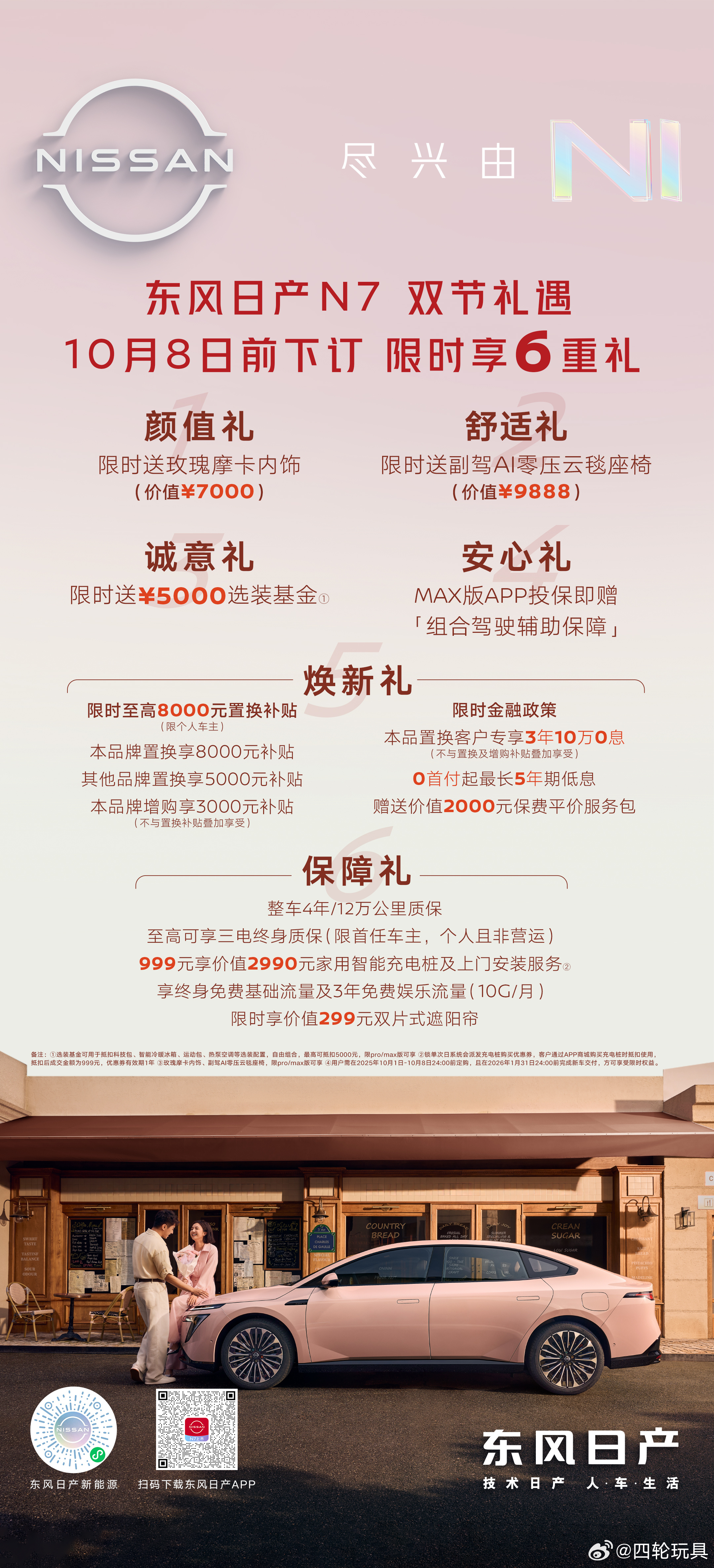 眼下也算是金九银十的购车旺季了,N7也推出了一个“双节限时6重礼”的政策,让消费者在假期时间也能获得6 重福利,将价值上数万元的选配配置拿出来直接送,按照这个销量和热度,不难看出N7后续很可能会持续领跑细分市场[并不简单]日产N7双节宠粉六重礼东风日产N7