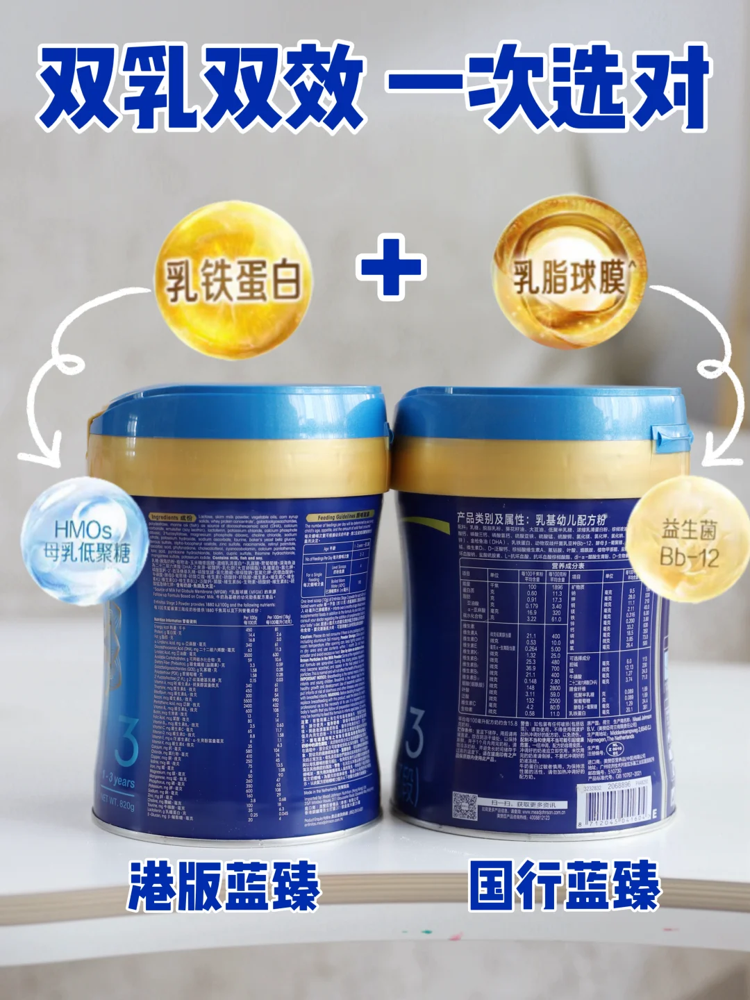 我选奶的时候也发现蓝臻有港版和国行两个版本,这两个版本的核心配方思路都是【双乳配方】,配方上有一点区别,港版额外添加了HMO,国行添加了250亿益生菌,都是对宝宝肚肚和自护力很友好的成分,大家按照自己的成分偏好或者购买便利程度选择就好。