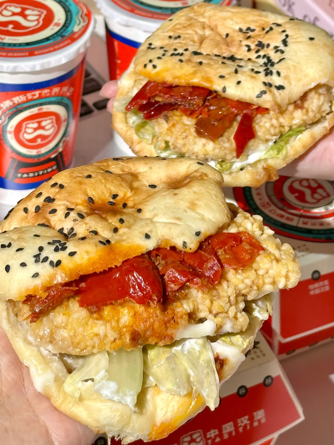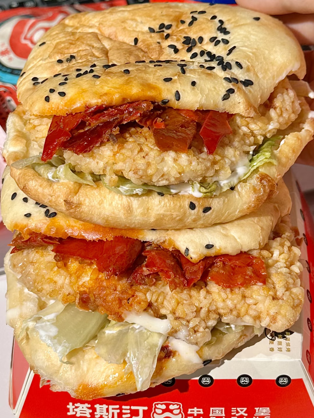 谁还没吃塔斯汀新出的新疆辣皮子鸡排中国汉堡?!