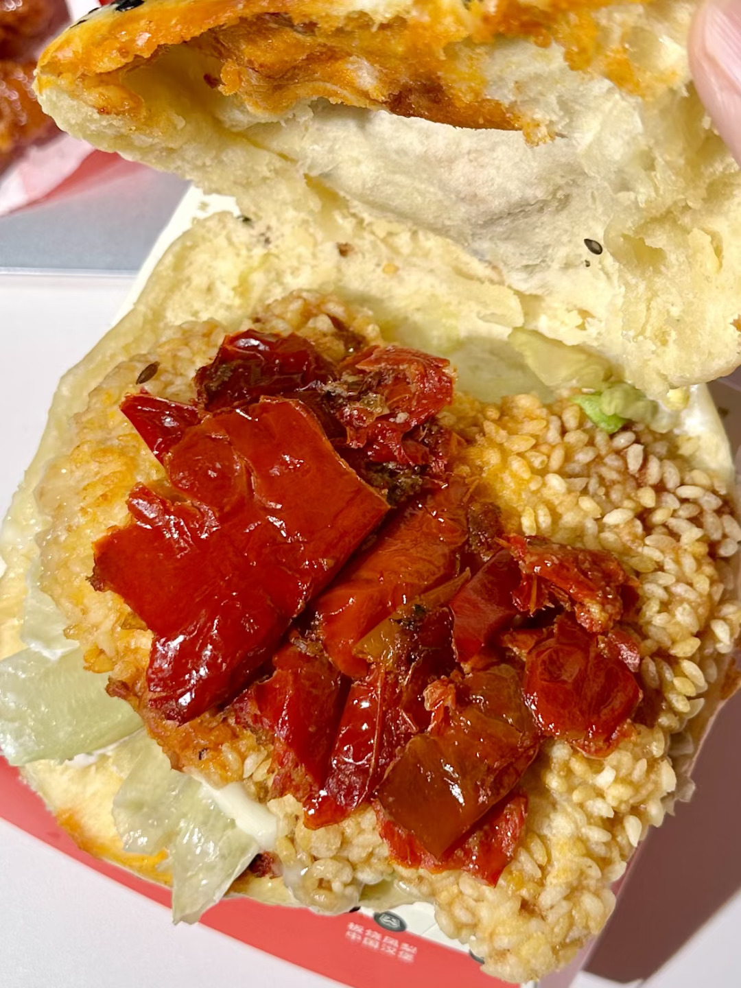 🍔刚打开包装就被香味勾住,鸡排炸得外脆里嫩,咬下去还会爆汁,辣皮子的香辣劲儿特别够味,不是那种冲喉咙的辣,是越嚼越香的那种,连面包胚都吸满了香味,一口下去太满足了!