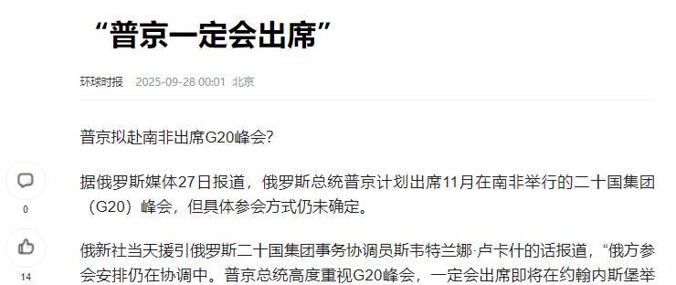 俄罗斯总统正式确认参加! 9月27日,俄罗斯总统确认参加11月南非举行的G20峰