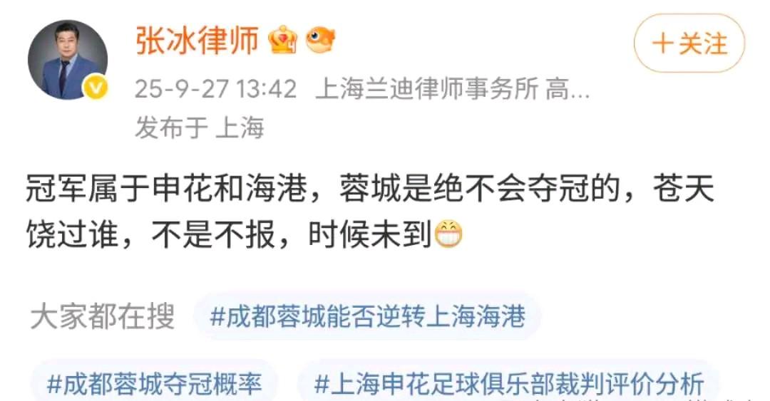 成都蓉城又咋了! 知名足球界律师张冰社媒:“冠军属于申花和海港,蓉城是绝不会夺冠的,苍天饶过谁,不是不报,时候未到!” 该律师经常代理一些球员和俱乐部的官司,难道又有什么幺蛾子,还是蓉城俱乐部或赞助商出什么问题了。 本赛季中期,蓉城俱乐部管理层曾说“降本增效”的话,不过看蓉城赞助商是越来越多,一家接一家过来赞助。 而且现在蓉城将士虽然已经很艰难,主力体能都透支了,但是都一直在坚持。不知道该律师咬牙切齿的痛恨蓉城,是什么原因!成都蓉城