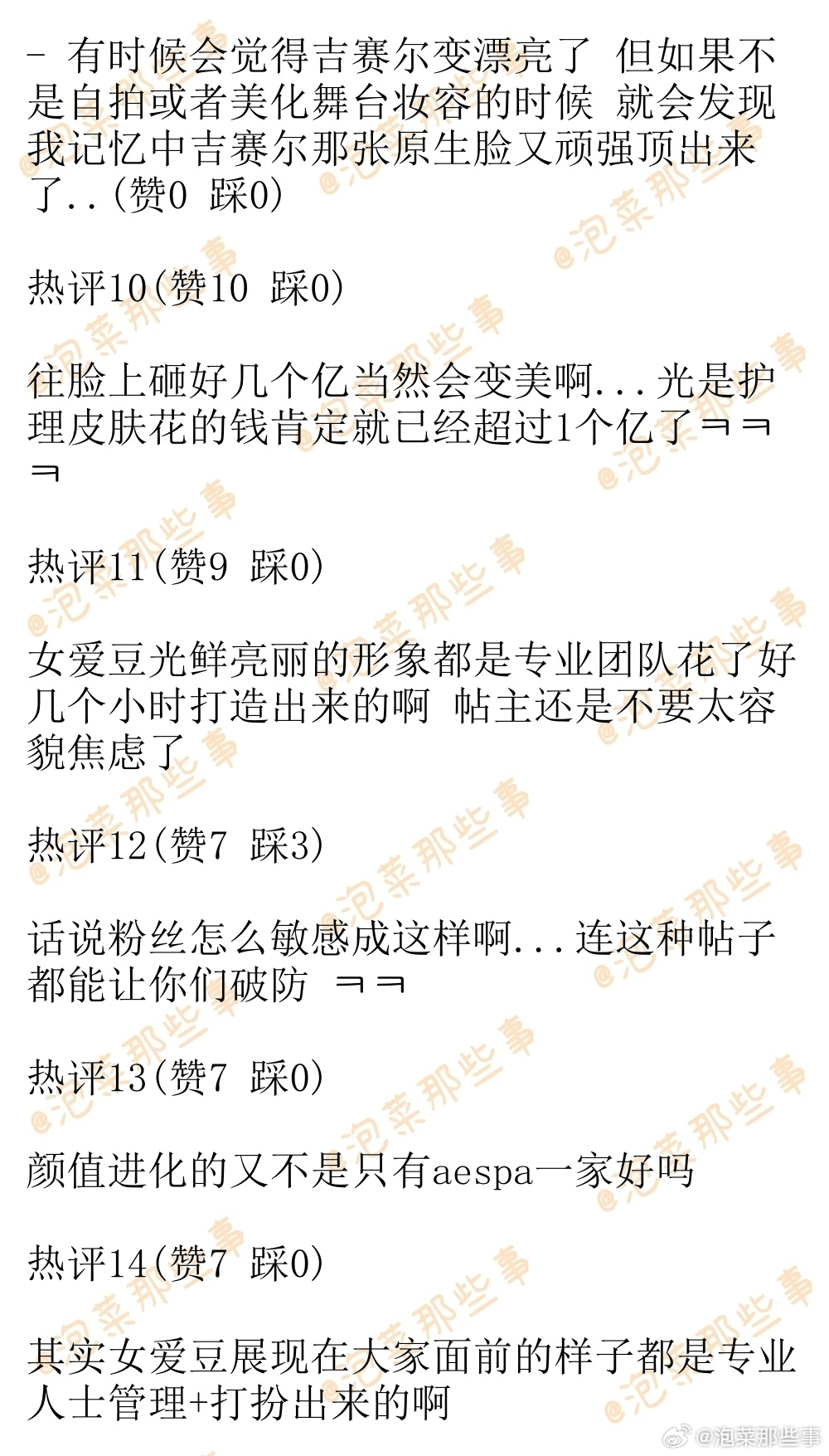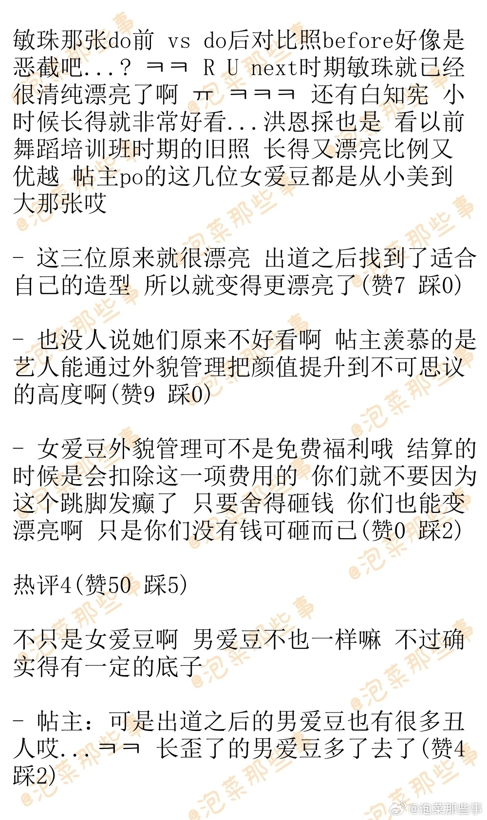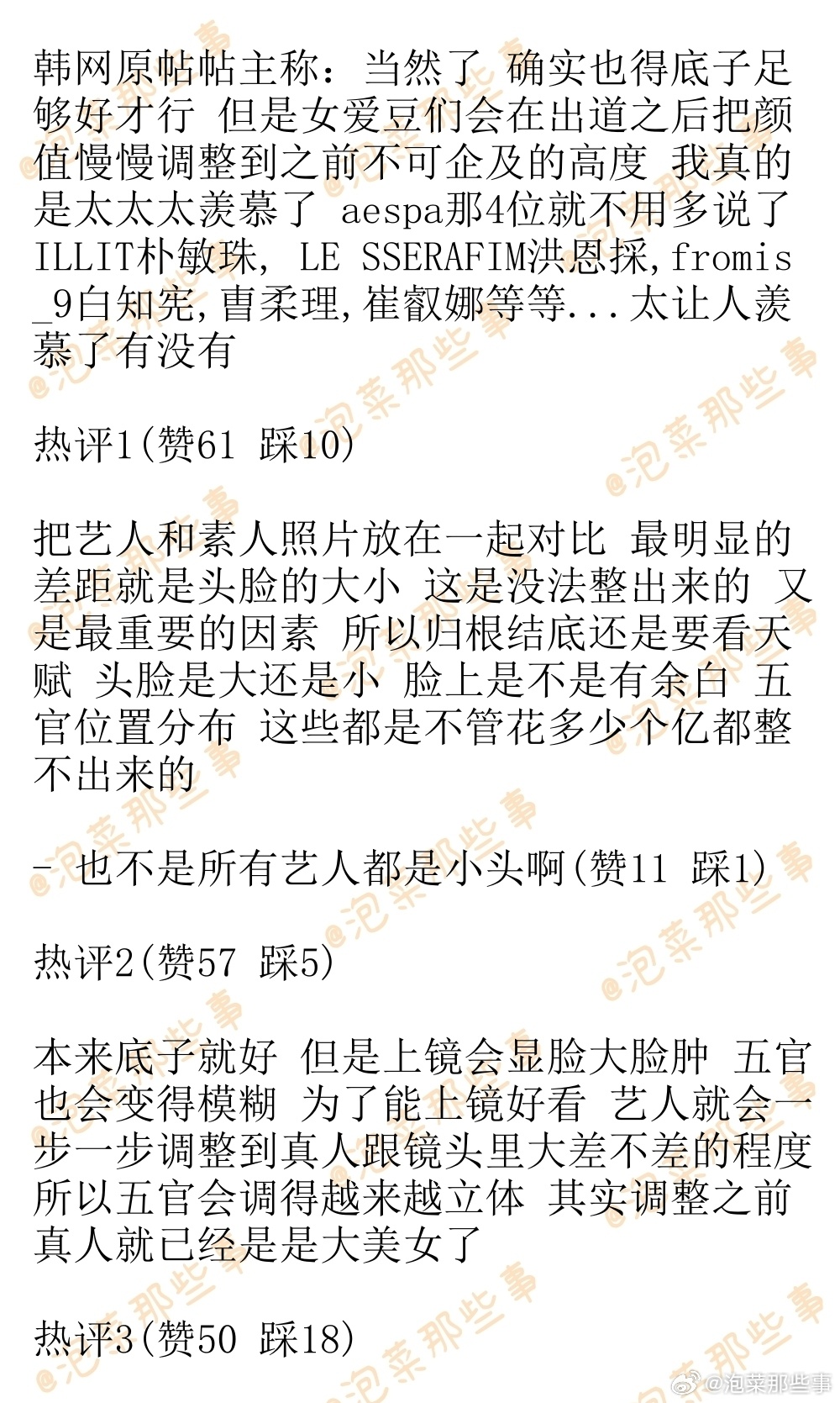 韩网原帖帖主称:当然了 确实也得底子足够好才行 但是女爱豆们会在出道之后把颜值慢慢调整到之前不可企及的高度 我真的是太太太羡慕了 aespa那4位就不用多说了 ILLIT朴敏珠, LE SSERAFIM洪恩採,fromis_9白知宪,曺柔理,崔叡娜等等...太让人羡慕了有没有