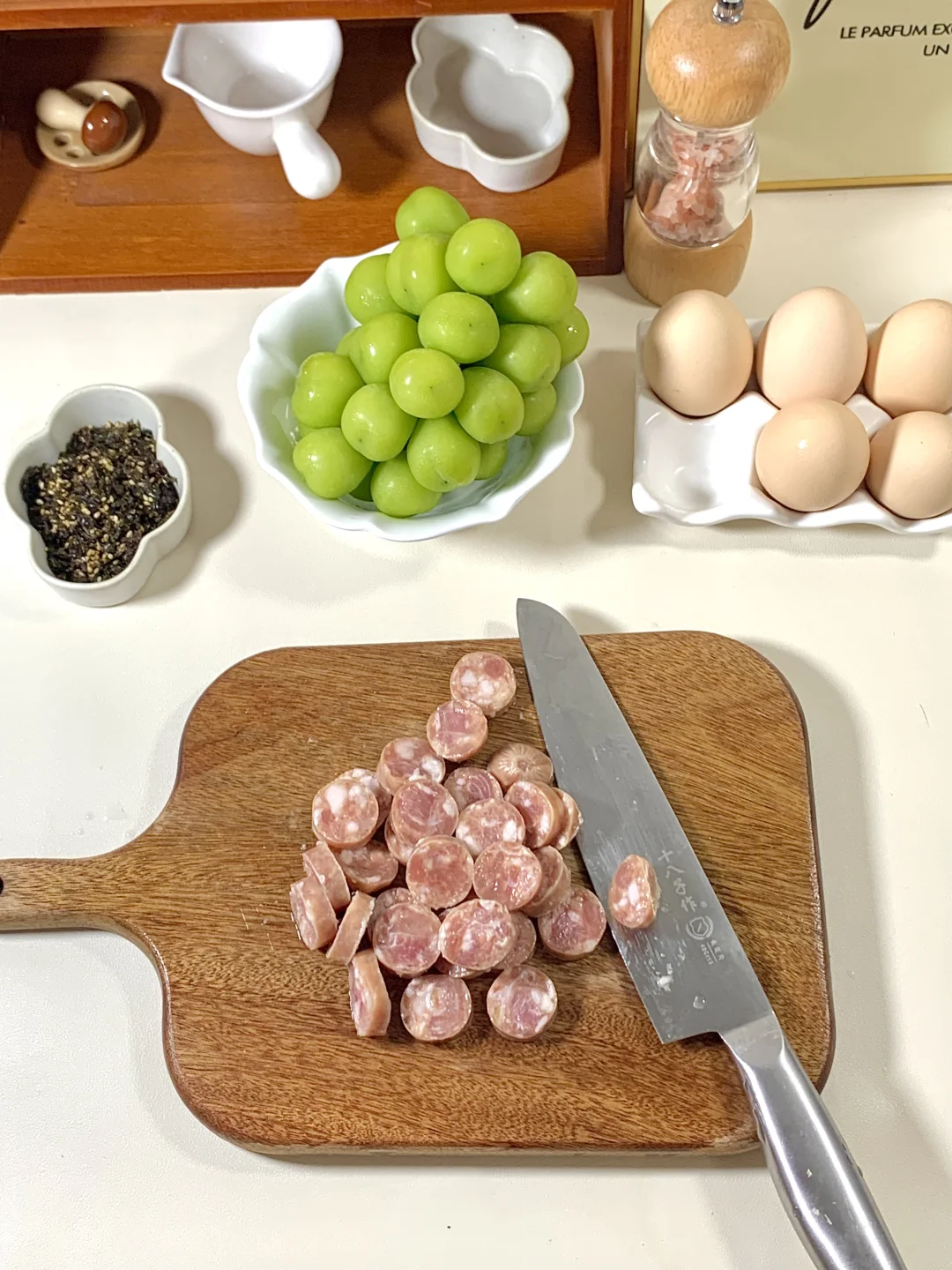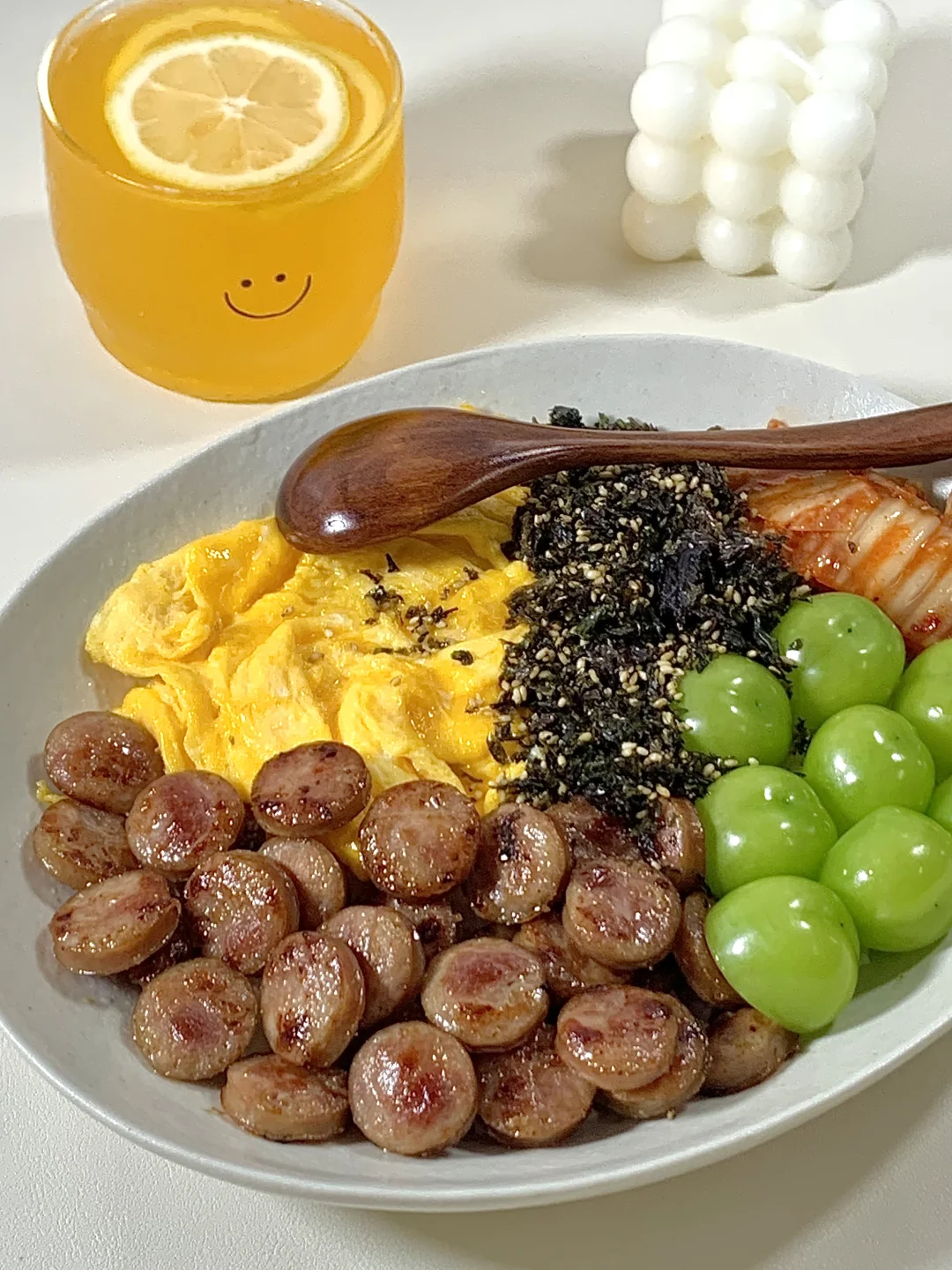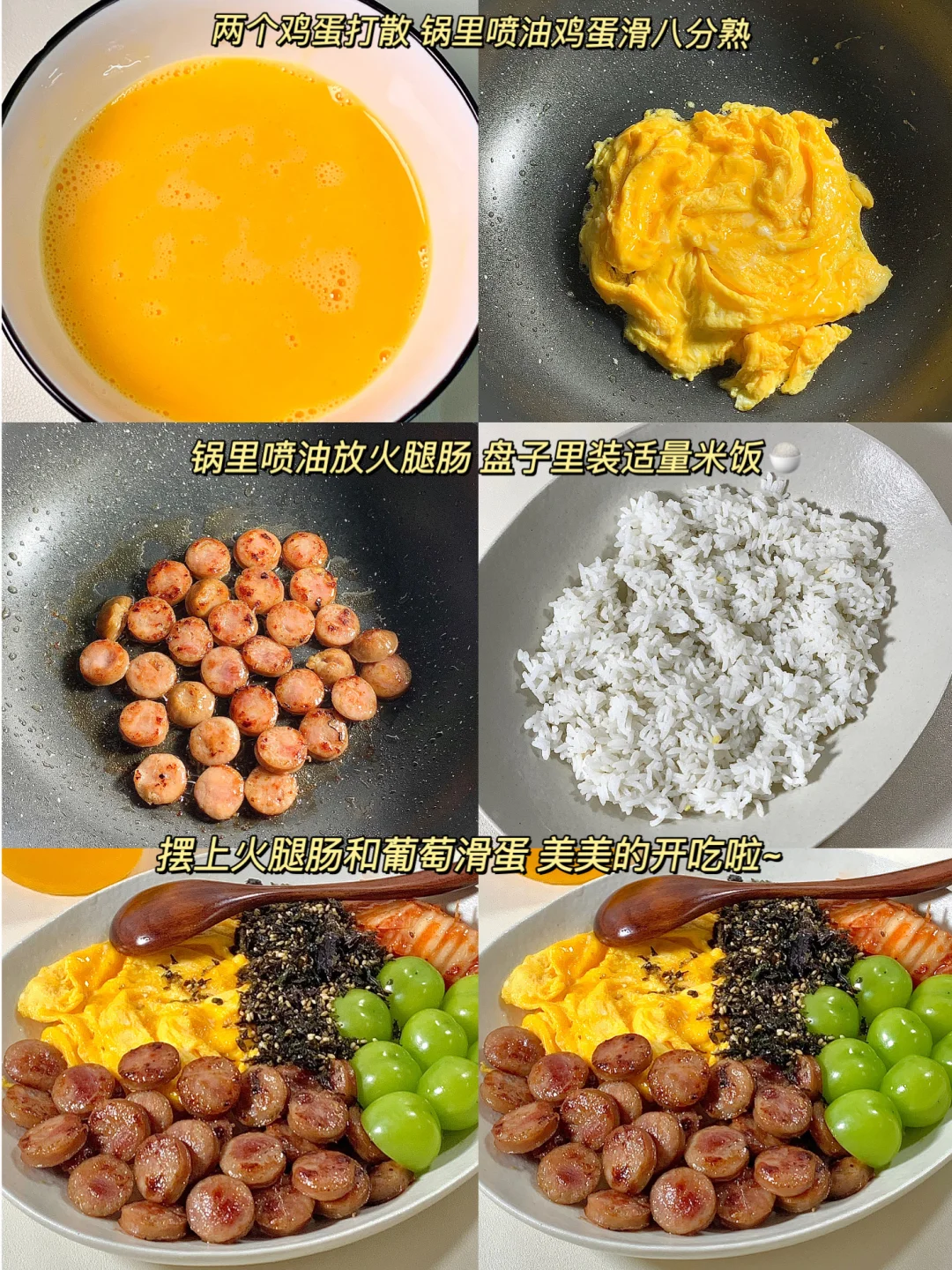 🍃盘里装适量米饭,摆上火腿肠和滑蛋跟葡萄🍇