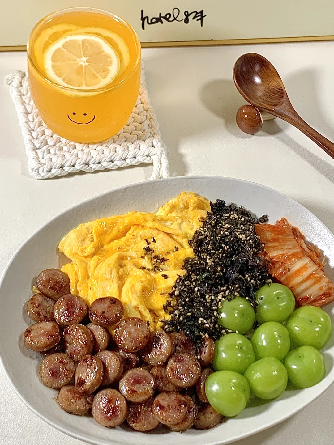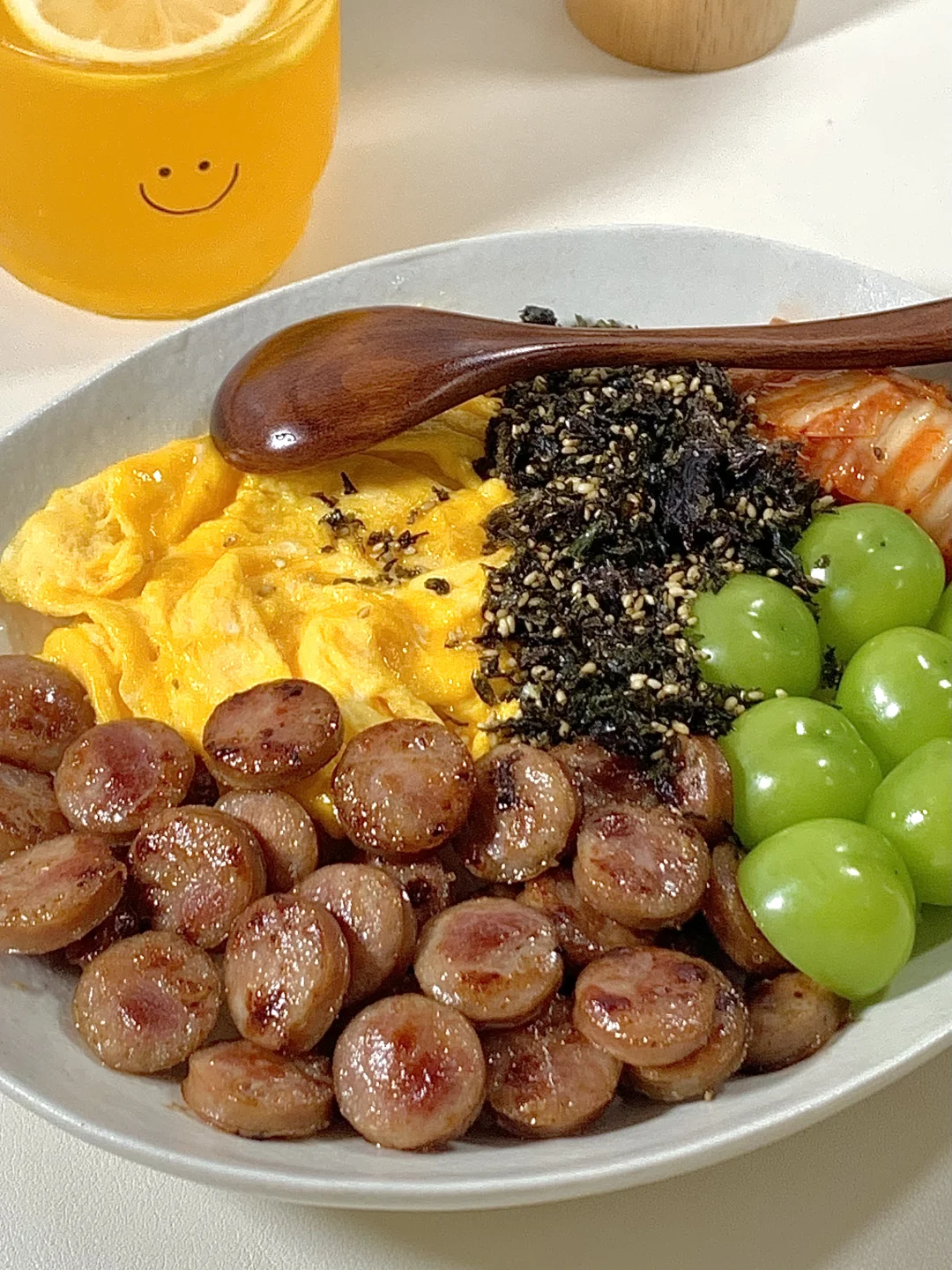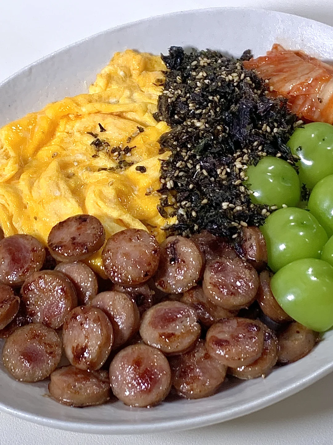 🍃盘里装适量米饭,摆上火腿肠和滑蛋跟葡萄🍇
