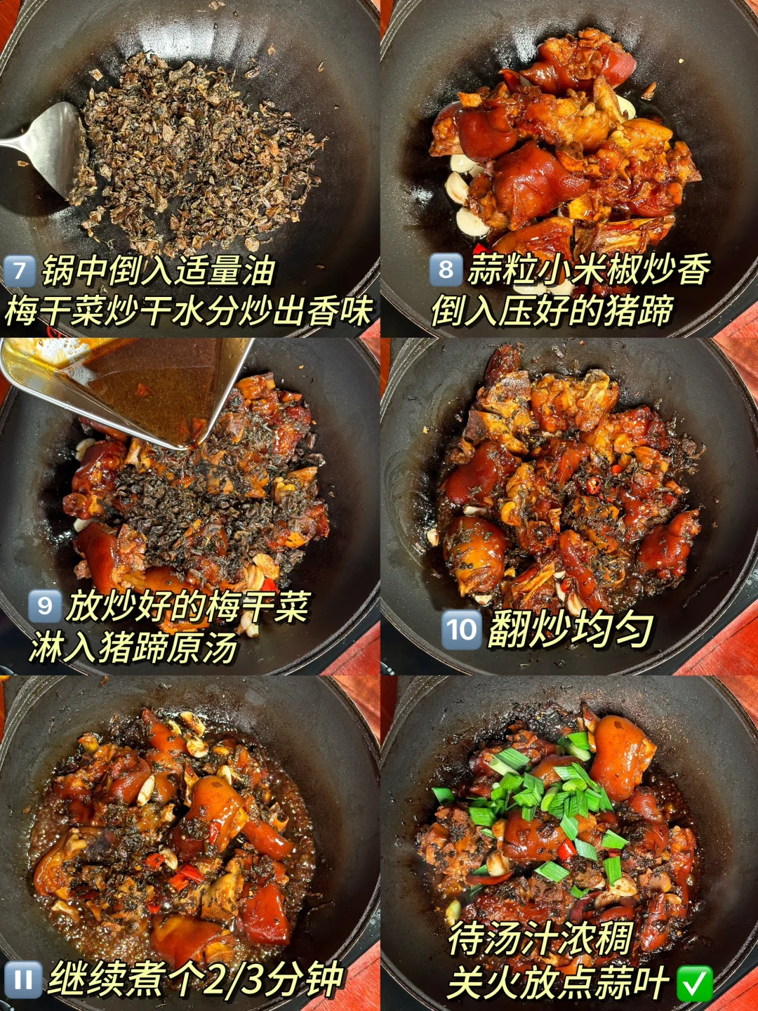 3️⃣锅中倒入适量油,倒入梅干菜炒干水分炒出香味盛出,接着爆香蒜子和小米椒,倒入压好的猪蹄 放入炒好的梅干菜,淋入猪蹄原汤,翻炒均匀,继续煮个2–3分钟,待汤汁浓稠后关火撒点蒜叶即可完成✅