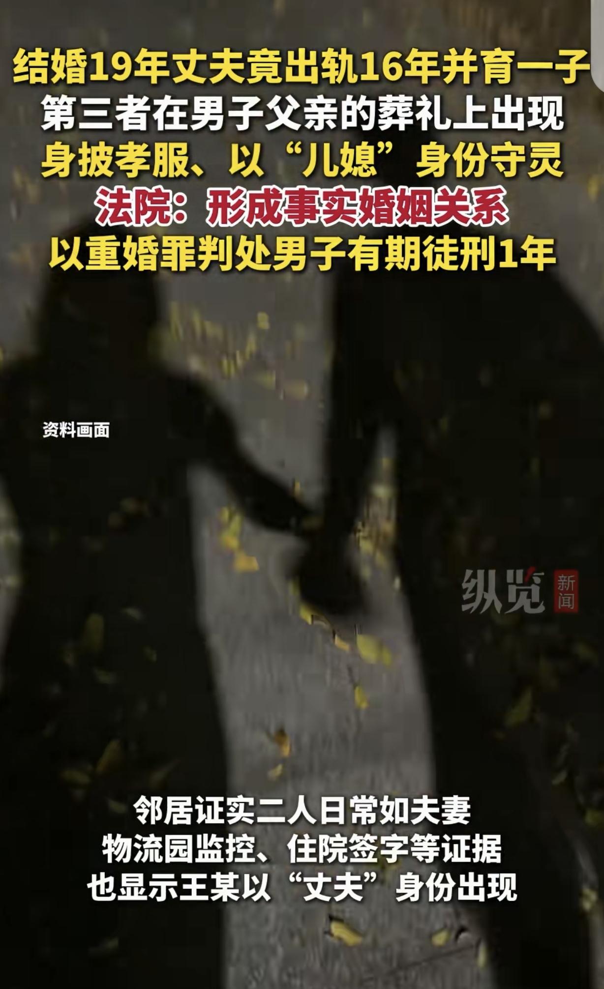 “藏了16年还是露馅了!”山东临沂,一女子在公公葬礼上,发现有个陌生女子披麻戴孝,以“儿媳”身份守灵,她心里咯噔一下,她惊讶的发现,跟她结婚19年的丈夫,竟然出轨16年,还生了个私生子,更以跑“长途货运”为名不回家,跟第三者同居,女子愤怒的把丈夫告上法庭,第三者却狡辩:我们就是搭帮过日子,没领证,不算重婚。法院的判决出乎意料。 2022年6月,尚女士的公公寿终正寝,她作为儿媳妇,尽职尽责的帮丈夫操持葬礼,送公公一程,想最后尽一下孝心,让他入土为安。 可尚女士惊讶的发现,葬礼上出现一个陌生女子,她不但披麻戴孝,为公公守灵,还是以儿媳妇的身份。 尚女士顿时懵圈,她是儿媳妇,那自己是谁?她立马觉察到不对劲,难道丈夫家外有家? 说起尚女士和丈夫王某,他们已经结婚19年了,丈夫常年跑长途货运,夫妻俩聚少离多。 尚女士心疼丈夫在外面风餐露宿,风里雨里奔波,为了不让他牵肠挂肚,她决定做一个贤内助,上孝顺公婆,下抚养儿女,把家里打理的井井有条,做到了贤良淑德。 可公公的葬礼,陌生女子的出现,却让她的心都碎的七裂八瓣,经过调查,她这才不得不接受一个残酷的现实,跟她结婚19年的丈夫,竟然背叛了16年了。 原来,这个第三者叫温某,她2006年,就跟王某同居,还生了个儿子。 2016年,王某为了跟温某长相厮守,哄骗尚女士,说他要跑长途货运,然后常年不回家,其实,就是跟温某以夫妻名义,开始了同居,过起了日子,还生了儿子。 尚女士心碎不已,悲痛欲绝,丈夫已经移情别恋,她还在家,傻了吧唧的心疼他,为了这个家风雨无阻,可人家早就始乱终弃了。 尚女士一腔的委屈,都化作愤怒,既然你不忠,别怪我无情,她一纸诉状,把丈夫以重婚罪告上法庭。 可温某竟然狡辩,说她和王某就是搭帮过日子,又没领证,何来重婚? 做的真周密,最后还是露馅了。这下好了,两个老婆的孩子以后都过不了政审。私生子真的不能继承 不然乱套了。 如不爱请别伤害,男方确实叛轻了,小三女方应因破坏她人家庭及给她人造成身心伤害给出赔偿,背叛的人会给另一方带来心灵伤害,也有可能给受伤方造成一辈子心里影响,女人应自爱,男人应自律。 结婚19年,出轨16年,与小三共育一子,对原配来说这是一个天大的笑话,漠视了婚姻的神圣。判那么轻,重婚成本太低,谁还敢结婚? 非婚生子无权利继承遗产财产,原配有权利要回期间所有费用,且女方在她人婚姻存续期间,以第三者有意破坏她人婚姻也应该受到相应的处罚。 应该重婚罪和女方属于破坏婚姻罪,两个人应该合并处罚,重婚罪一年是有点少,我觉得三年起步,破坏婚姻罪的应该也要一年以上。 要不然罚款吧,发现出轨小三罚款定额高一点,这样小三也不爱被白嫖了,和男人要钱男人也难受,能杜绝一大部分出轨的情况不? 现在社会好了、日子安稳好过了、吃得太饱太好了、营养过剩了、欲望膨胀压不住、有自郁自闭的,有跳桥跳楼的,有背叛养小二小三的有养鸡养鸭的……所以人不要让他吃得太饱。 《刑法》第258条规定:有配偶而重婚的,或者明知他人有配偶而与之结婚的,处二年以下有期徒刑或者拘役。 王某在与尚某婚姻存续期间,2003年结婚至2022年案发,自2006年起与温某同居并育有一子,2016年后以夫妻名义共同生活,邻居、物流园监控、住院签字等证据均证实二人长期以夫妻关系对外示人。 法律规定,持续稳定的同居关系且对外以夫妻名义生活,即构成刑法意义上的“事实婚姻”。 温某辩称“未领结婚证”不成立。我国刑法保护“一夫一妻制”,不因未重复登记而免责,重婚罪的核心在于破坏合法婚姻关系。 法院认定王某构成重婚罪并判处有期徒刑1年,符合刑法量刑范围二年以下,但量刑偏轻可能是因认罪态度或没造成更严重社会危害。 如果温某明知王某已婚仍与之同居并以夫妻名义生活,可能构成重婚罪的共犯。 但本案没追究她的刑事责任,或因证据不足,如无法证明温某的“明知”。 《民法典》第1091条规定:有下列情形之一,导致离婚的,无过错方有权请求损害赔偿: (一)重婚; (二)与他人同居; (三)实施家庭暴力; (四)虐待、遗弃家庭成员; (五)有其他重大过错。 王某的重婚行为直接侵害尚某的配偶权,尚某可在离婚诉讼中要求损害赔偿,包括精神损害赔偿,因丈夫长期出轨导致的心理创伤、财产分割倾斜,要求多分夫妻共同财产、追回对第三者赠与的财产,如果王某用夫妻共同财产抚养私生子,尚某可主张返还。 尚某还可要求法院在财产分割时照顾无过错方权益。 现行法律没直接将“破坏婚姻”行为规定为侵权,但如果温某与王某共同使用夫妻共同财产,尚某可起诉其不当得利返还。 对此,你怎么看? 关注@灋律盐究员 学法辩是非,用法止纷争。