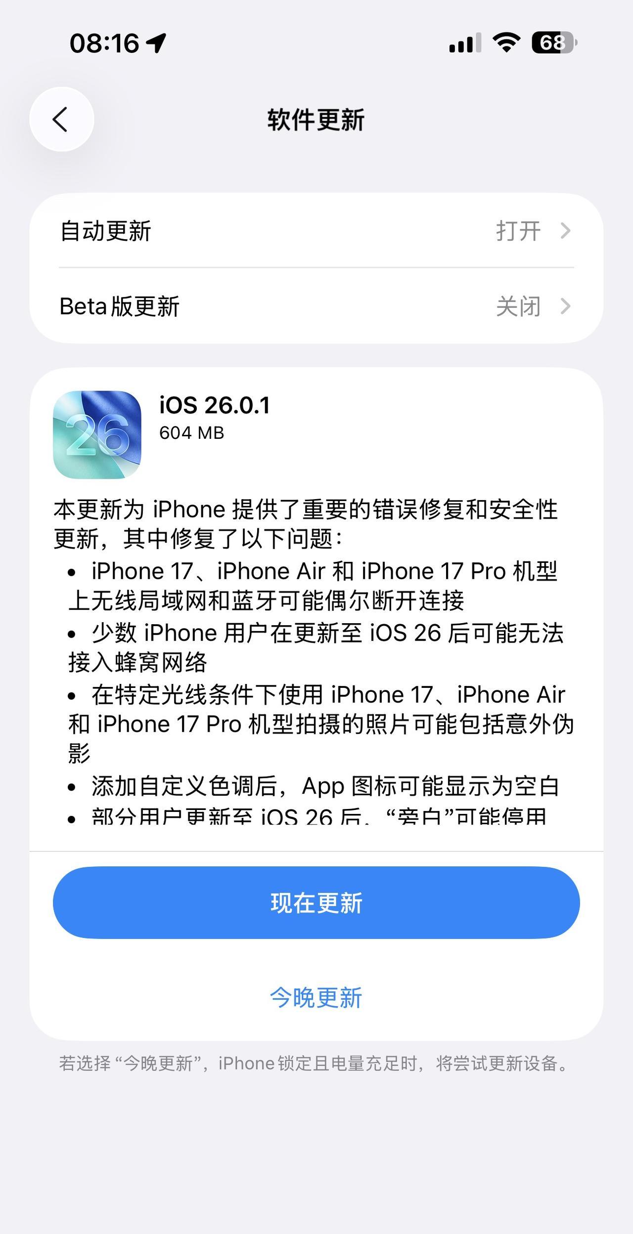 iOS 26.0.1 推送,主要修复了 iPhone 17、iPhone Air 和 iPhone 17 Pro 机型上无线局域网和蓝牙可能偶尔断开连接的问题。 你升级 iOS 26 了不?[吃瓜群众]