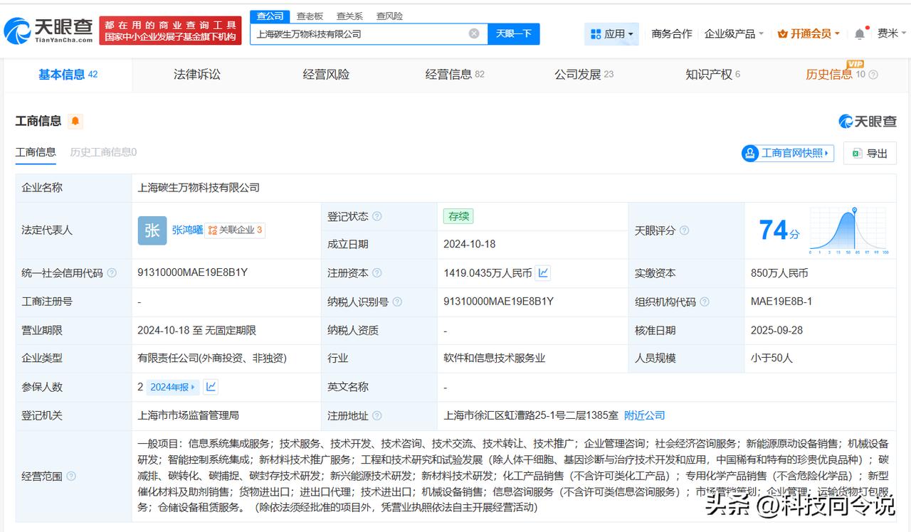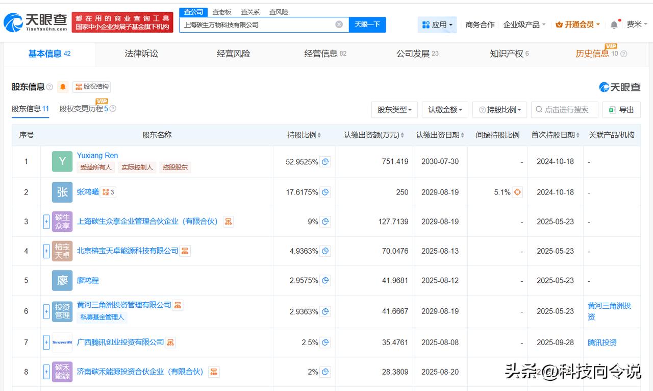 【腾讯等入股碳生万物科技公司】 天眼查App显示,近日,上海碳生万物科技有限公司发生工商变更,新增广西腾讯创业投资有限公司、济南碳禾能源投资合伙企业(有限合伙)、宁波碳维新能源科技有限公司为股东,注册资本由约1277万人民币增至约1419万人民币,同时多位高管发生变更。 该公司成立于2024年10月,法定代表人为张鸿曦,经营范围包括信息系统集成服务、企业管理咨询、社会经济咨询服务等,现由Yuxiang Ren、张鸿曦及上述新增股东等共同持股。公开资料显示,该公司聚焦碳科技与新材料领域创新应用,致力于为化工、能源行业提供清洁技术解决方案。 天眼查信息: