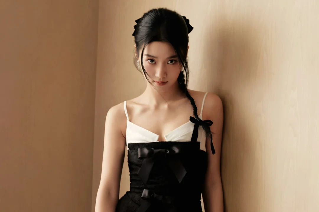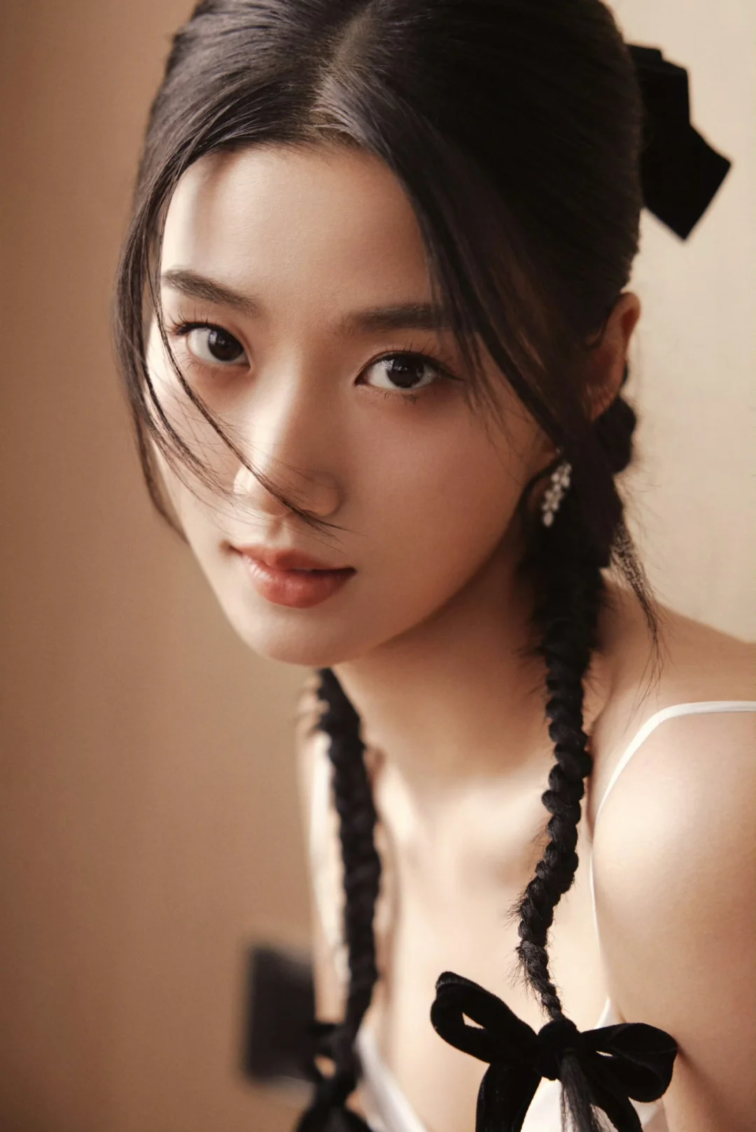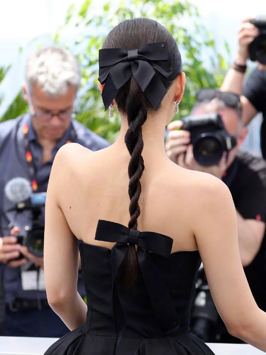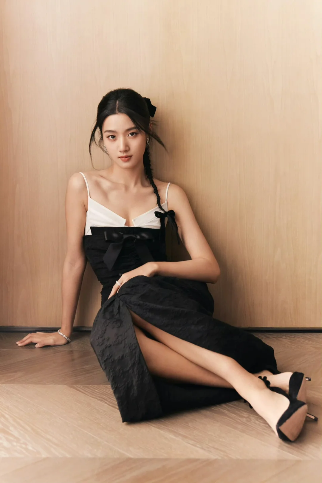 卢昱晓今日ELLE红毯的出发图(红毯穿的不是这一身),黑白蝴蝶结拼接礼服+双麻花辫发。
