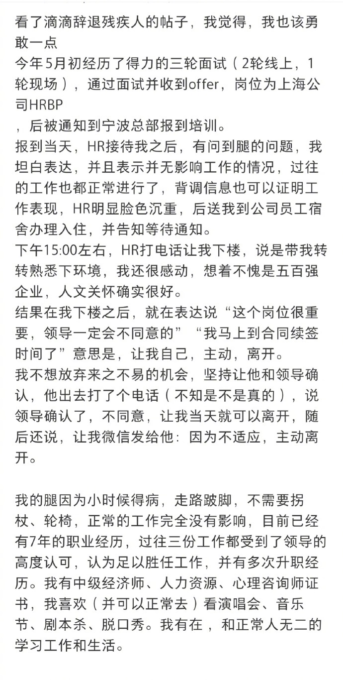 【#得力集团总裁就辞退跛脚员工道歉#】#因跛脚被辞退女子称不会去得力工作# 近日,女子小钱(化名)在社交平台发帖称,今年5月初,她在通过得力集团三轮面试并收到HRBP岗位offer后,在报到当日因跛脚被得力集团HR要求主动离开。#得力集团辞退跛脚员工#