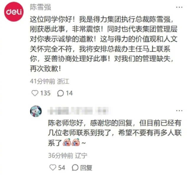 事情发生后,得力集团执行总裁陈雪强发消息称,“刚获悉此事,非常震惊!同时也代表集团管理层对你表示诚挚的道歉!这与得力的价值观和人文关怀完全不符,我将安排总裁办主任马上联系你,妥善协商处理好此事。”