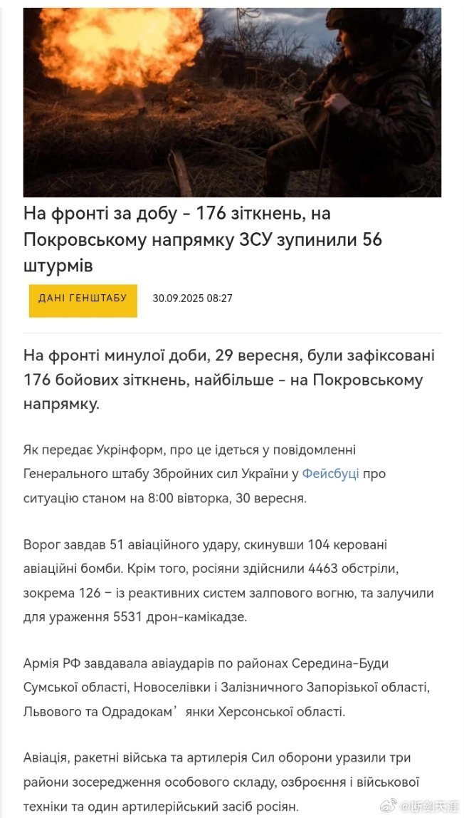 在过去的一天,即 9 月 29 日,记录了 176 起战斗冲突,其中大部分发生在波克罗夫斯克方向。