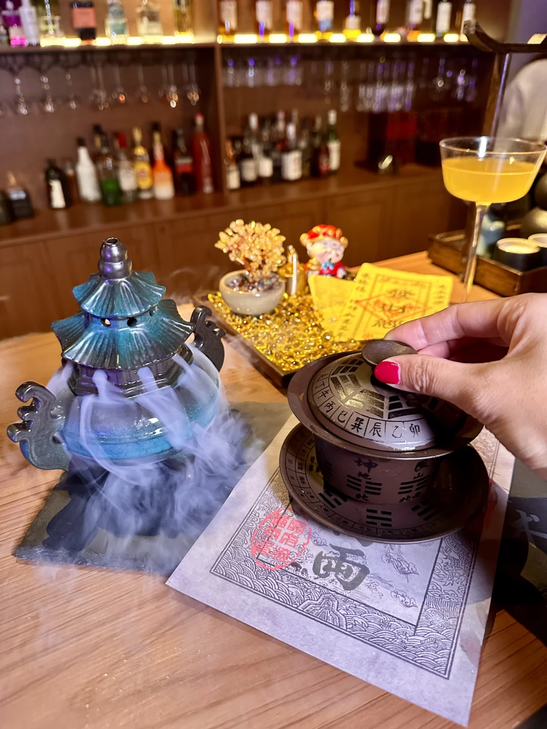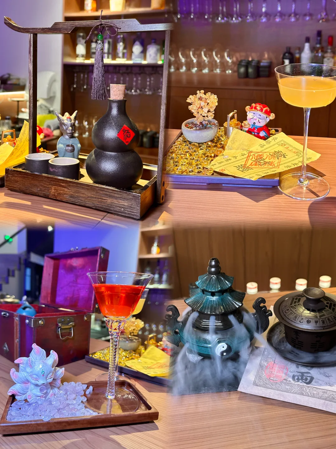 她家的鸡尾酒,更是把玄学元素玩明白了,每款名字都让人忍不住想点,而且造型也都是满满的道学仪式感
