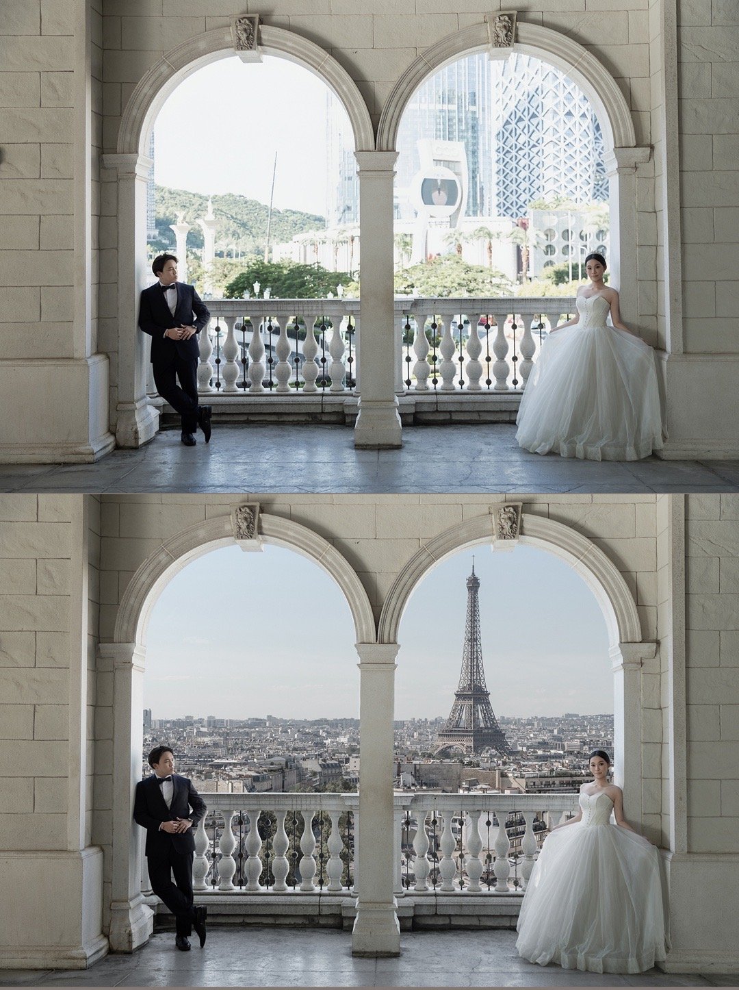 澳门婚纱照客片。巴黎铁塔合成前后对比。没去过澳门的人是真的会以为背景就是这样,其实是用法国巴黎市区的照片合成的[doge]