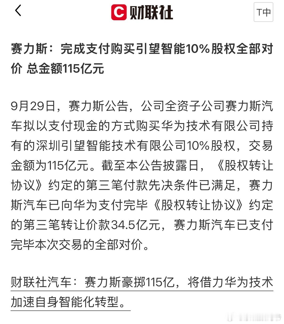 赛力斯:已支付完毕购买华为持有的引望智能10%股权的全部对价 总金额115亿元