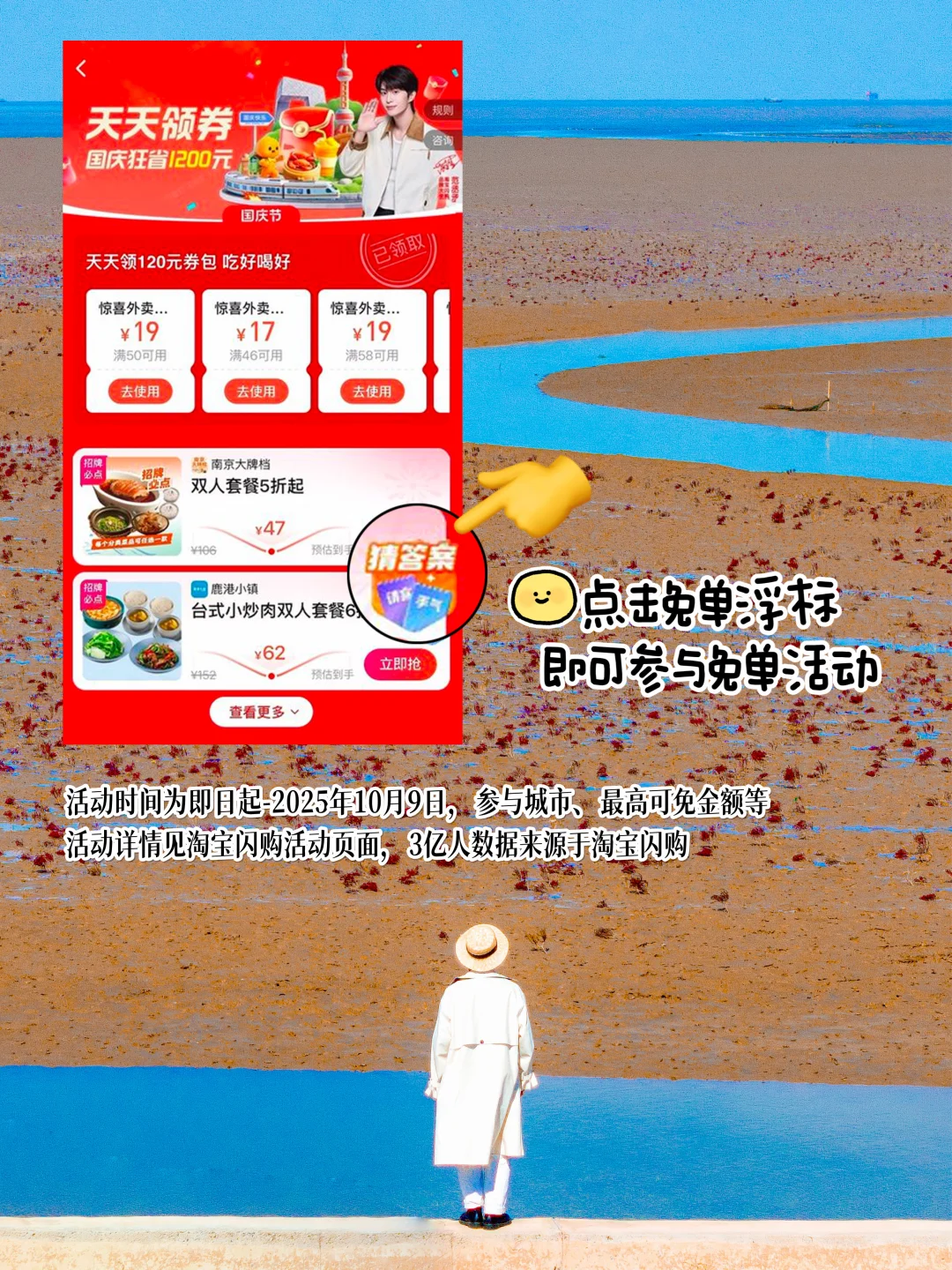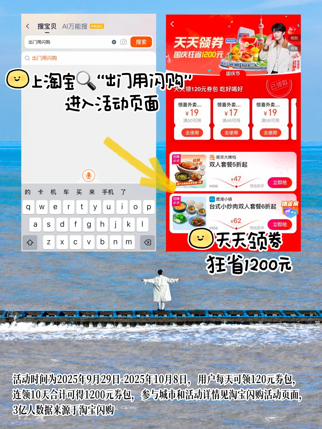 📌划重点:国庆上淘宝搜【出门用闪购】,天天领券省 1200 元,长假每天抢免单,快乐直接翻倍,冲!