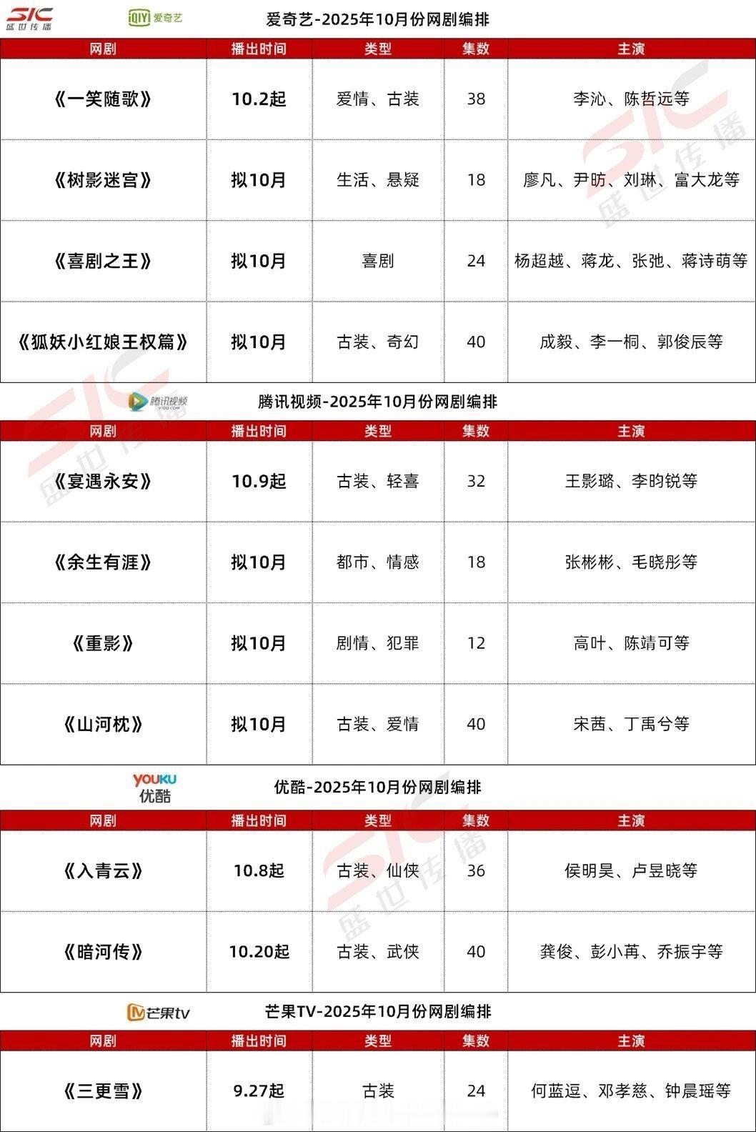 各大卫视平台10月排播片单:《水龙吟》《许我耀眼》《无忧渡》《一笑随歌》《喜剧之王》《狐妖小红娘王权篇》《宴遇永安》《余生有涯》《山河枕》《入青云》《暗河传》等…
