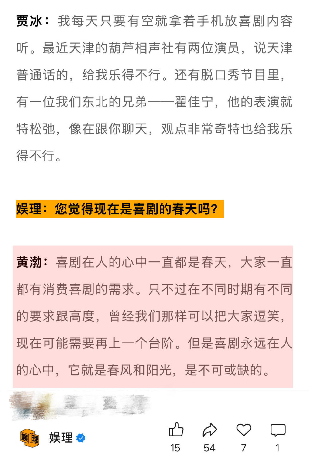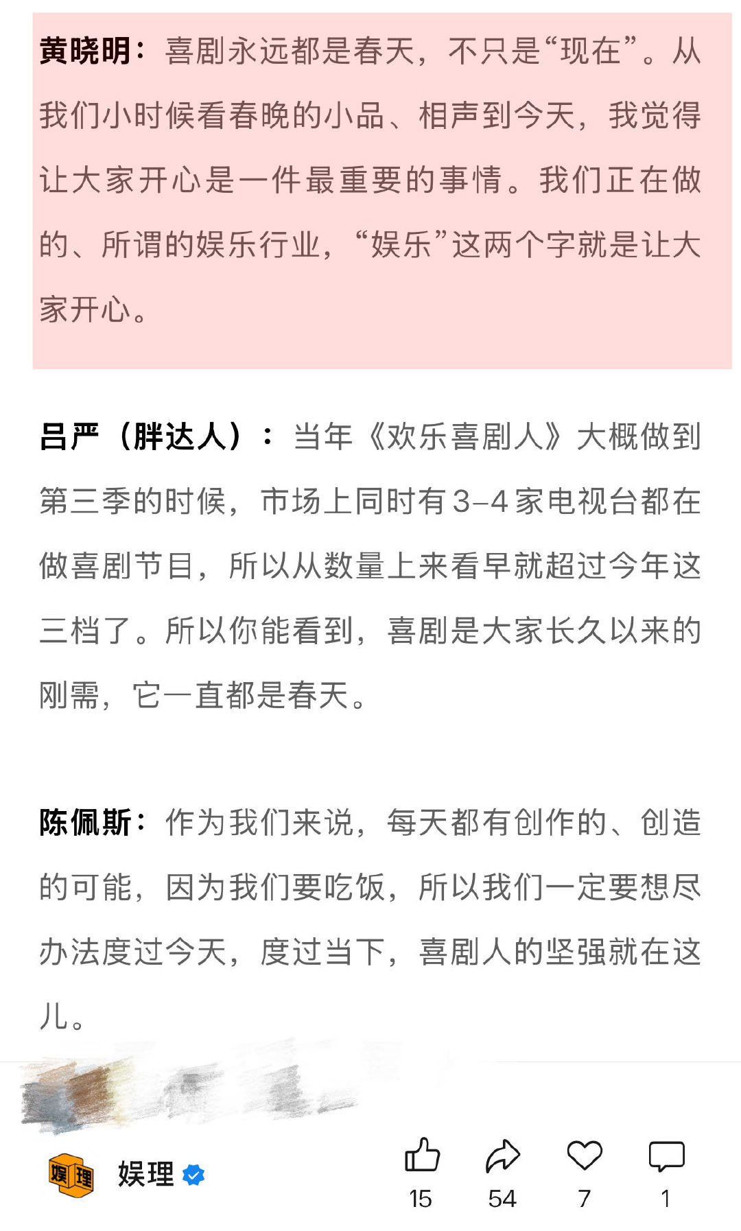 陈佩斯黄渤黄晓明谈喜剧的春天 范丞丞说演员在和观众共同进步 在黄渤看来,“喜剧一直都是春天,大家一直都有消费喜剧的需求。”黄晓明认为“喜剧永远都是春天,娱乐就是让大家开心。”吕严以《欢乐喜剧人》举例,表示“喜剧是大家长久以来的刚需,它一直都是春天。”陈佩斯则谈到喜剧人“一定要想尽办法度过今天,度过当下,喜剧人的坚强就在这儿。”娱理独家↓