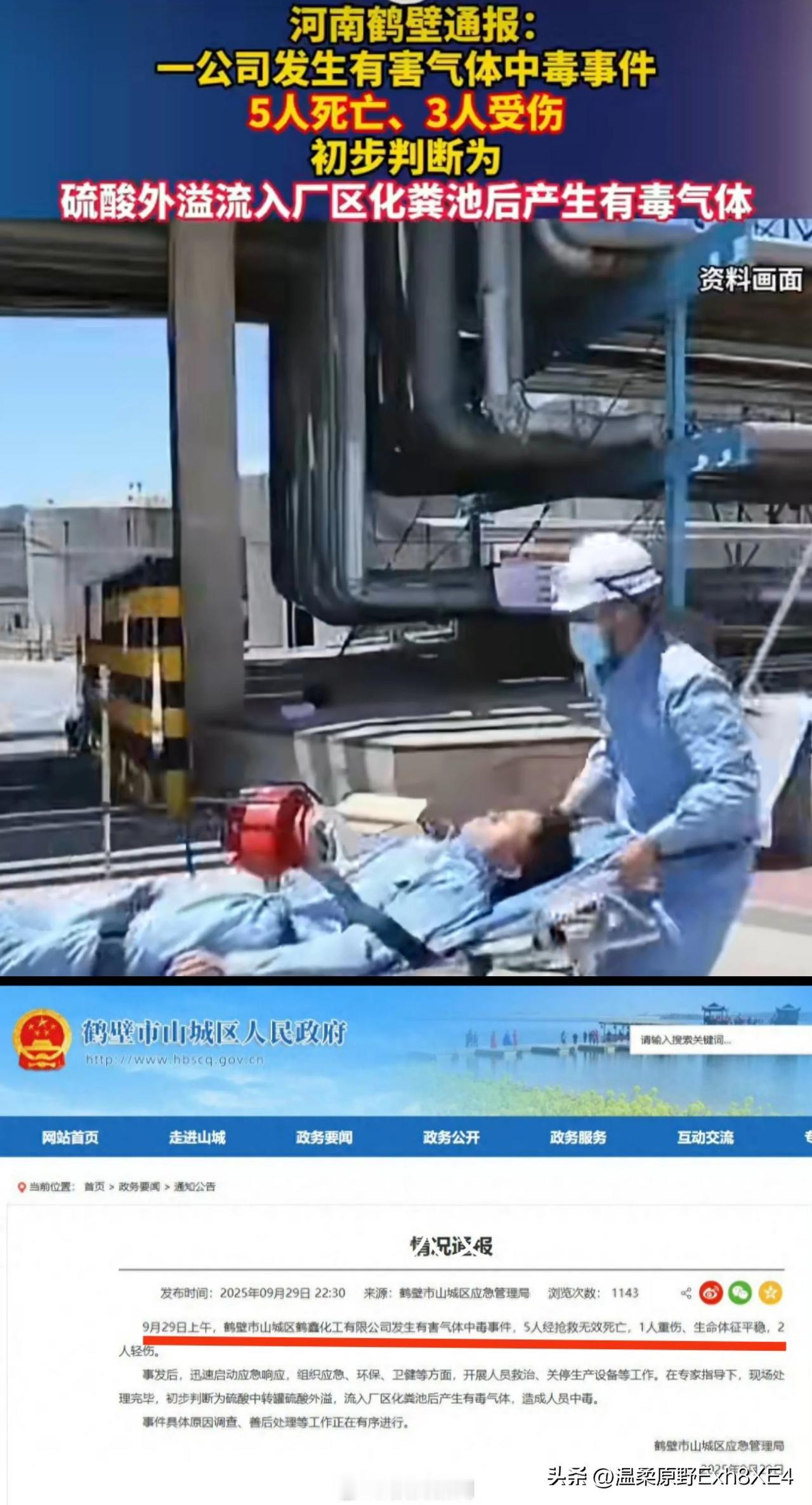 河南鹤壁一化工公司发生中毒事件,5死3伤,官方已通报。 事情发生于9月29日上午7点,鹤壁市山城区鹤鑫化工有限公司厂区公共厕所内。初步判定为硫酸中转罐外溢,经雨水管网流入化粪池,与有机废物反应生成硫化氢为主的有毒气体,导致了此次严重事故! 据披露,这个公司早在2018年就曾因为设备“跑冒滴漏”致污水排放,毒死了26万斤活鱼。22年,25年都曾被责令整改过。 安全生产天天嘴上说,这公司的领导是真没当回事啊!也是啊,也只有工人才会经常在厂里最危险的地,可他们也想不到上个厕所就能丢掉性命啊!而且还是在过节前夕! 中毒事故 化工厂安全事故 (消息来源:极目新闻)