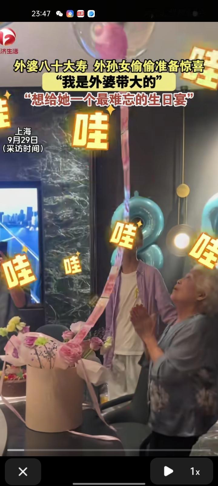 9月30日,上海。外婆过八十大寿,外孙女偷偷准备惊喜。吴女士说,她是外婆带大的孩子,小时候经常生病,外婆在三伏天背着她去看病。外婆是很低调的人,也非常节俭,想着借外婆庆祝八十大寿之机向外婆表示感谢,还要感谢家人们的配合,外婆非常开心。