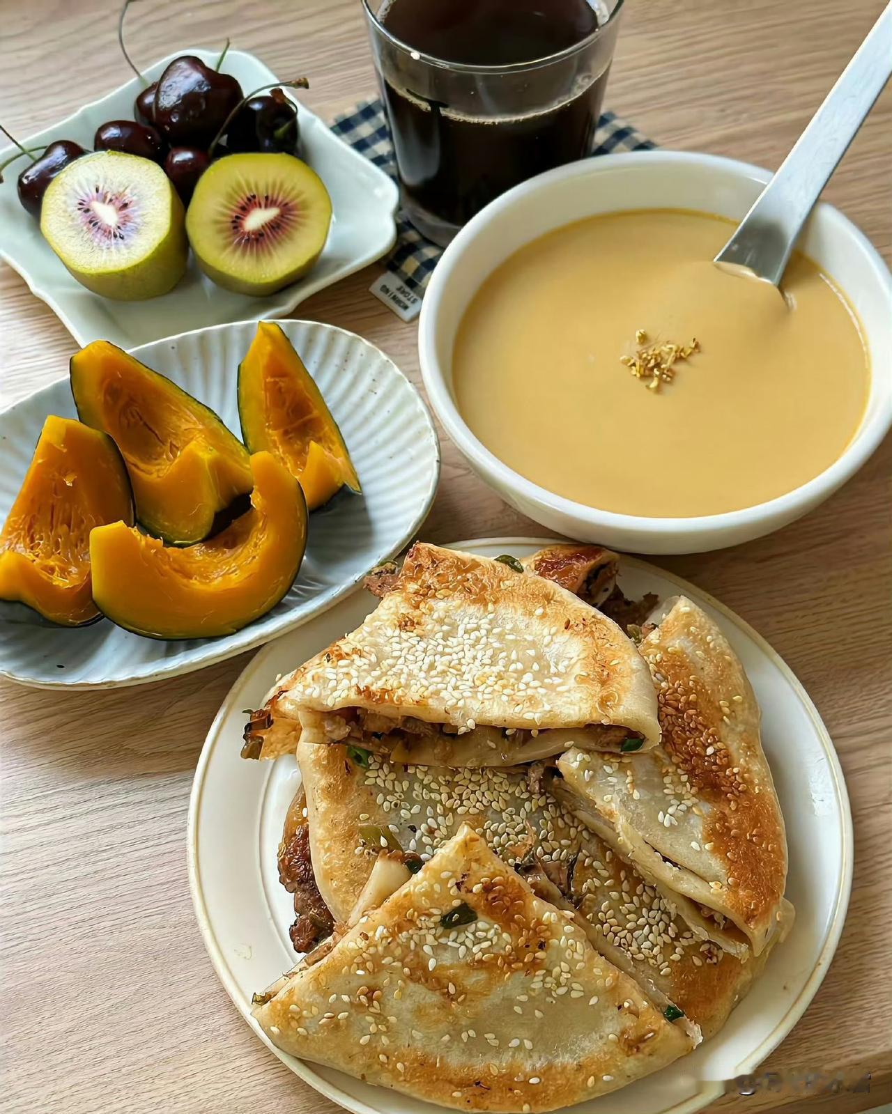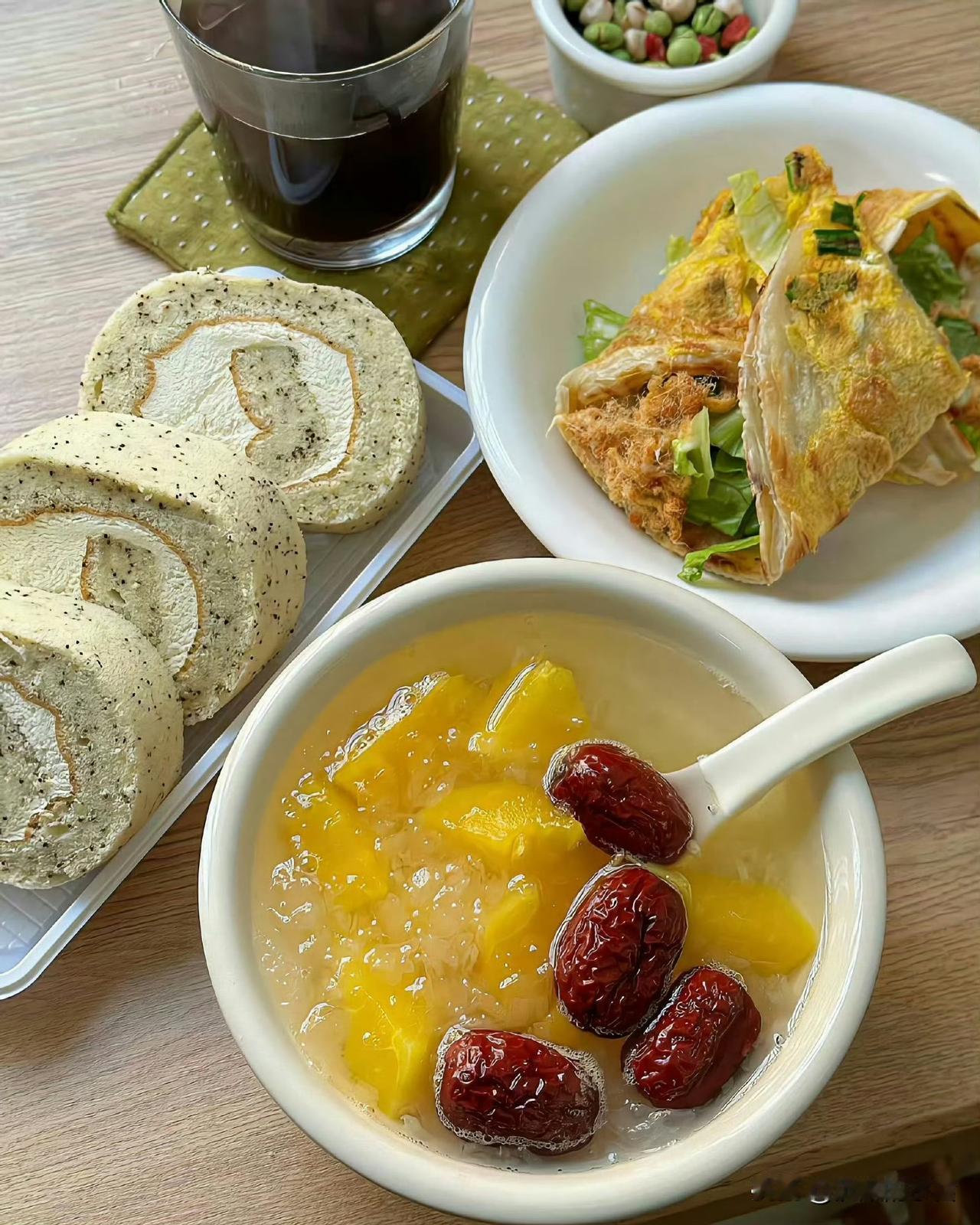 在平凡的清晨,用美食开启治愈时刻。 图一:红茶卷的绵密、煎饼果子的香脆,搭配一碗暖心的芒果红枣羹,再佐以一杯黑咖,每一口都是对味蕾的温柔犒劳。 图二:芝麻酱香饼的酥脆,南瓜的清甜,还有香浓的米糊,配上新鲜的车厘子和红心猕猴桃,让早餐的仪式感拉满,开启活力满满的一天。