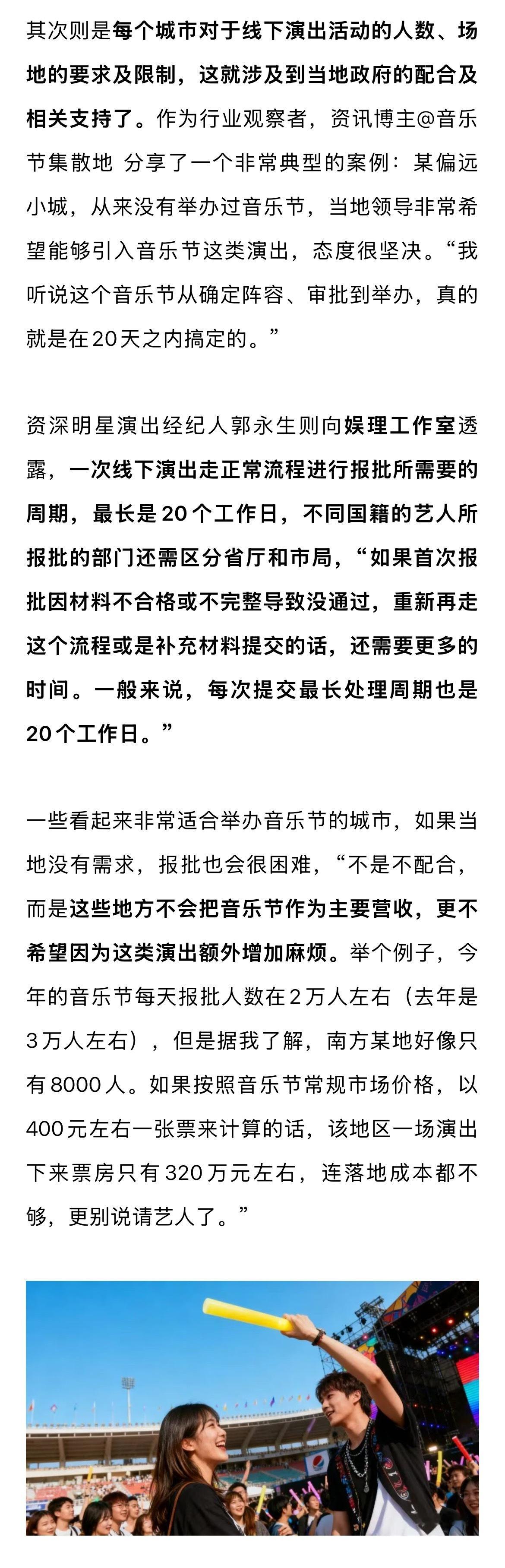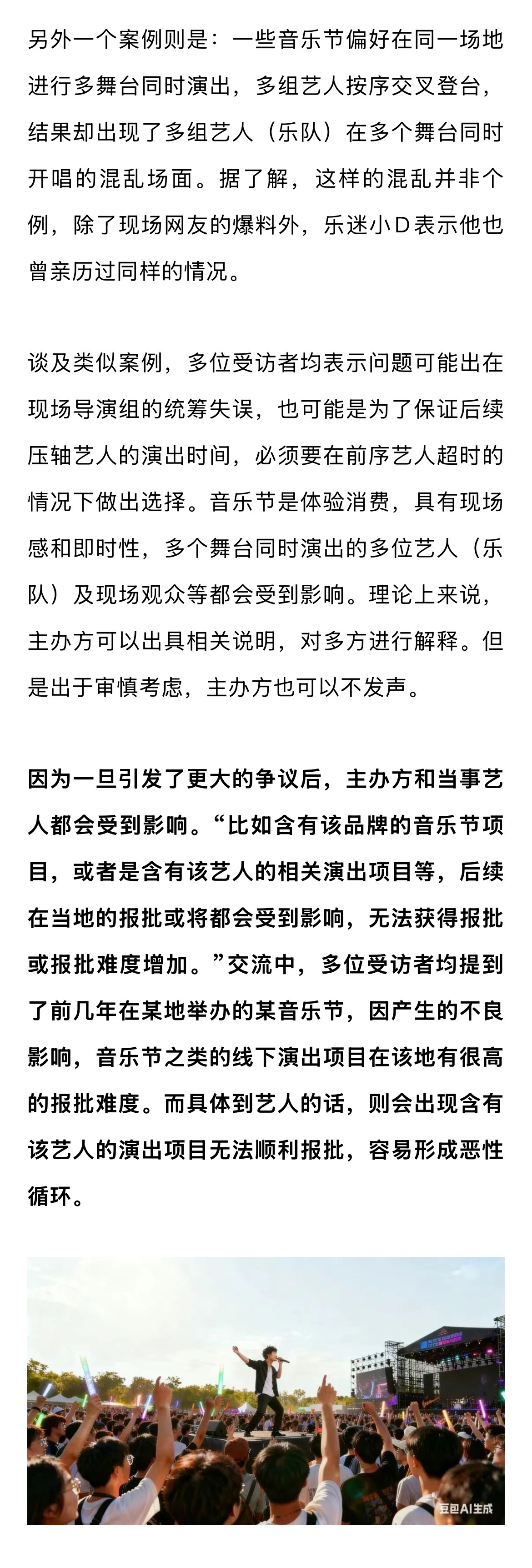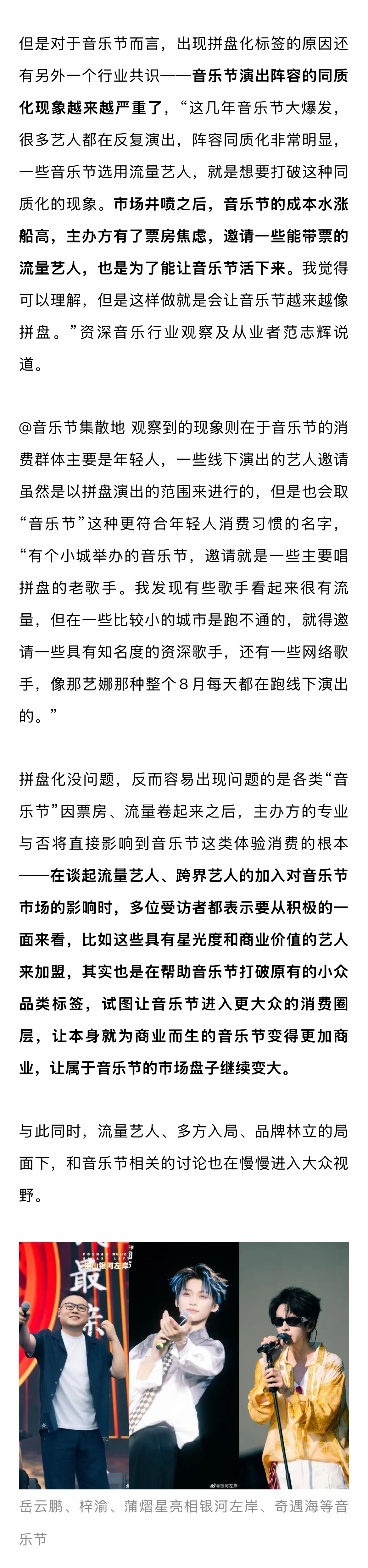 此外,音乐节拼盘化标签的出现,也是因为演出阵容的同质化现象越来越严重了,“一些音乐节选用流量艺人,就是想要打破这种同质化的现象。市场井喷之后,音乐节的成本水涨船高,主办方有了票房焦虑,邀请一些能带票的流量艺人,也是为了能让音乐节活下来…”娱理独家↓