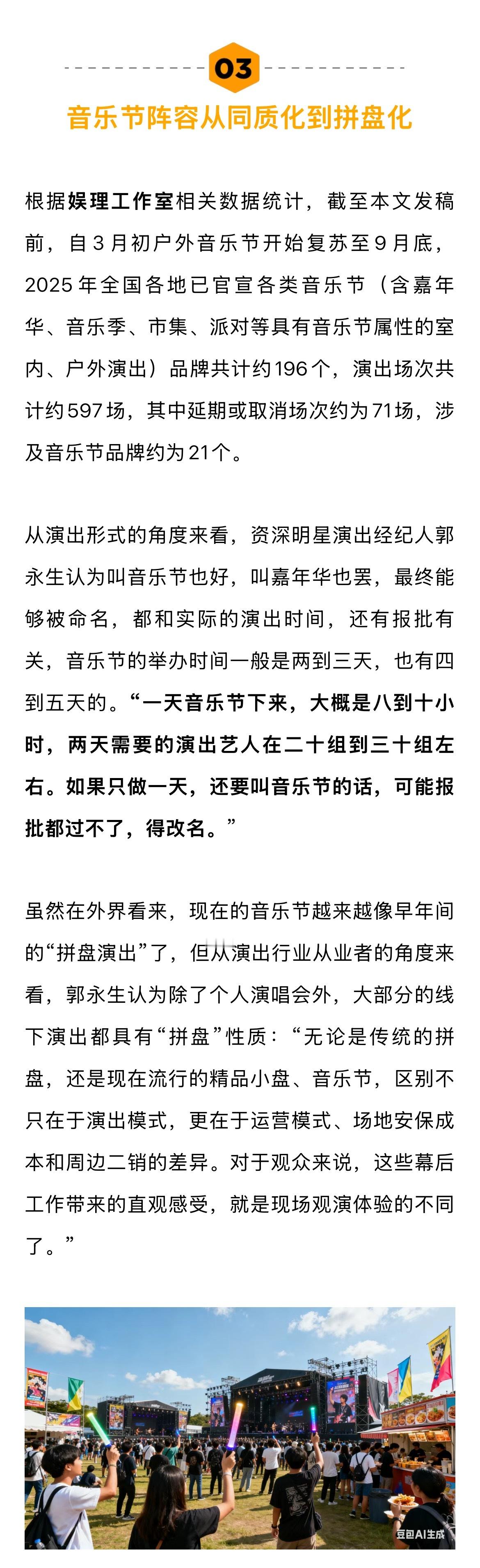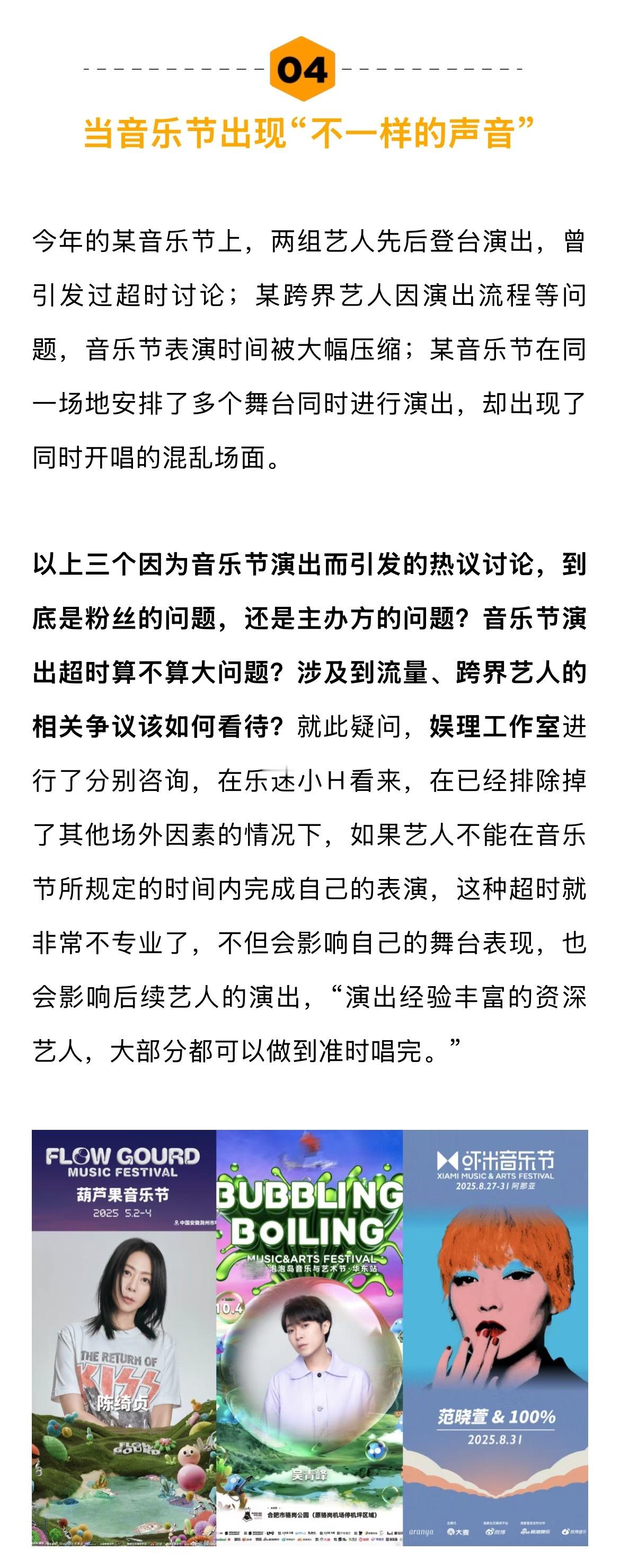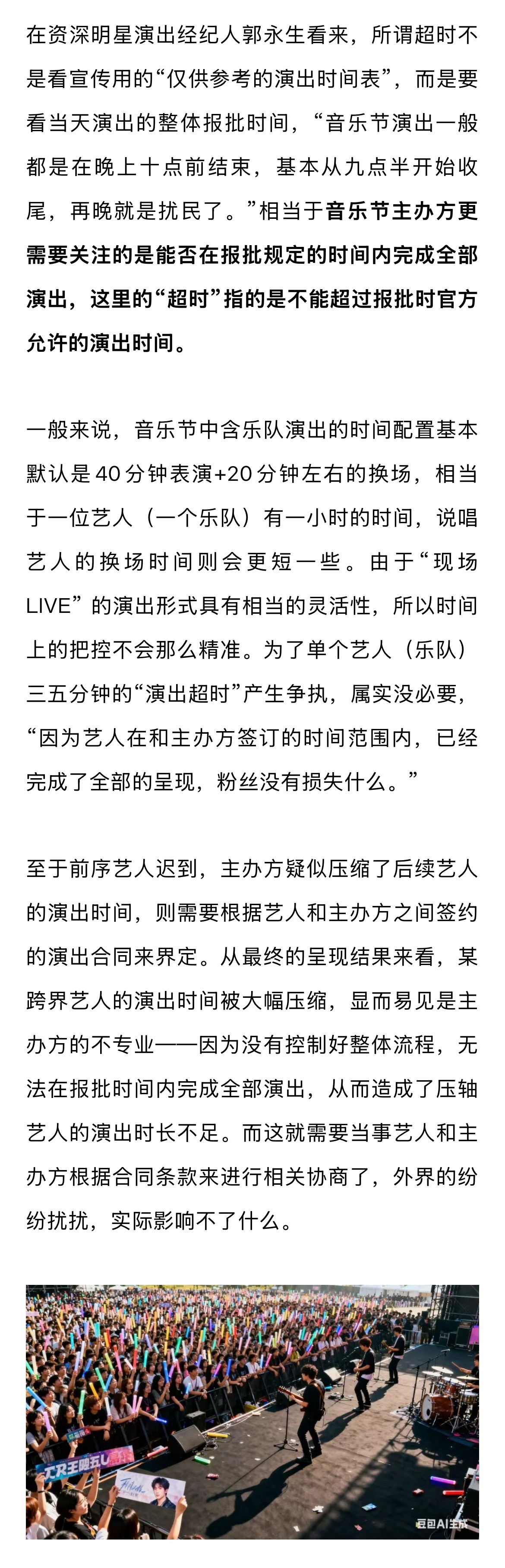 此外,音乐节拼盘化标签的出现,也是因为演出阵容的同质化现象越来越严重了,“一些音乐节选用流量艺人,就是想要打破这种同质化的现象。市场井喷之后,音乐节的成本水涨船高,主办方有了票房焦虑,邀请一些能带票的流量艺人,也是为了能让音乐节活下来…”娱理独家↓