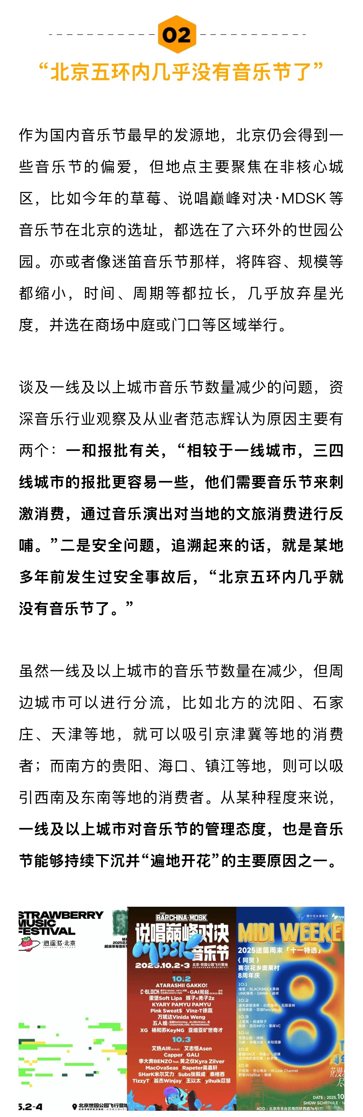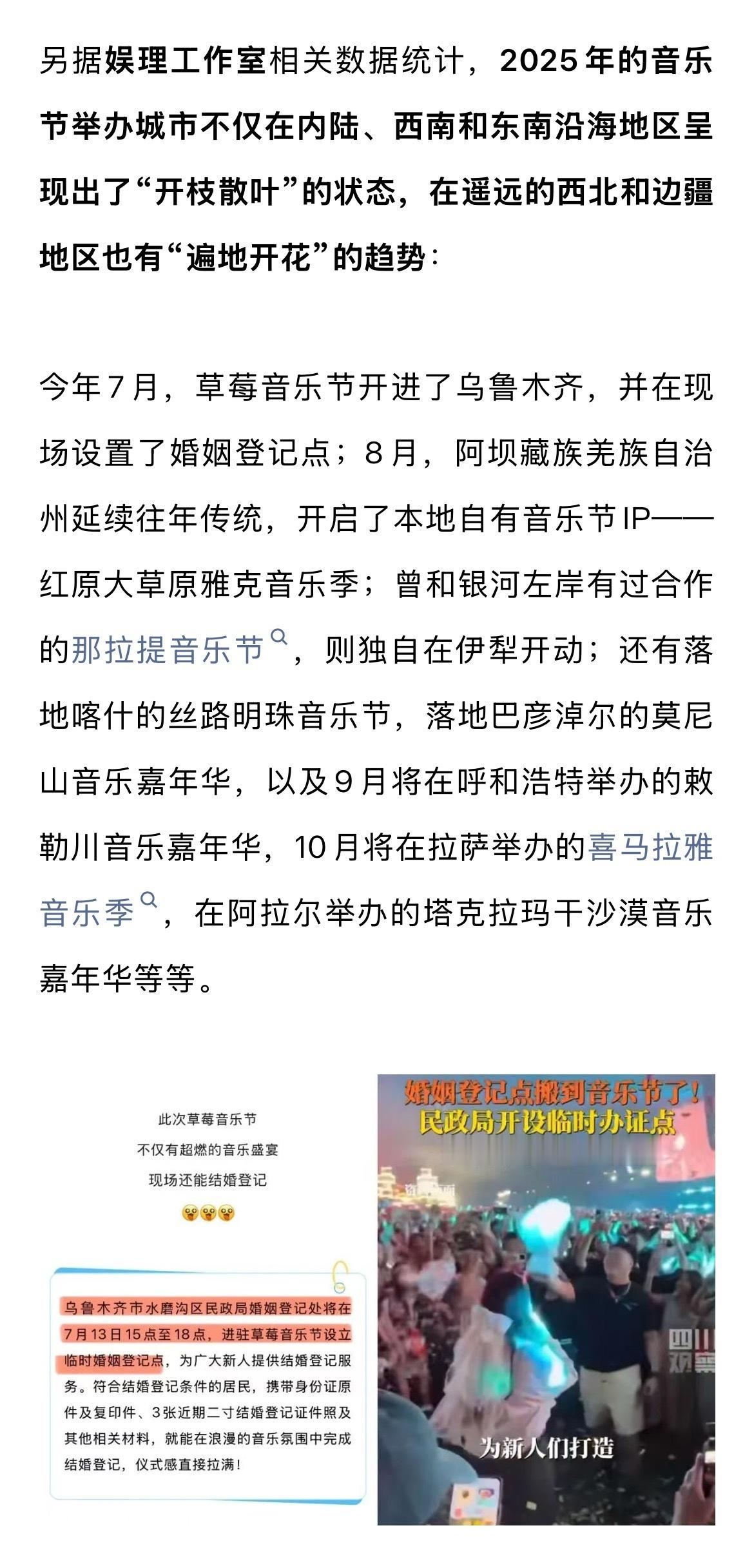 随着线下演出市场的“井喷爆发”,音乐节的一些基础形态也在近三年间完成了一次顺应市场氛围的新变化:首先是音乐节举办城市的下沉趋势愈加明显。据新浪娱乐工作室相关数据统计,2025年的音乐节举办城市不仅在内陆、西南和东南沿海地区呈现出了“开枝散叶”的状态,在遥远的西北和边疆地区也有“遍地开花”的趋势。