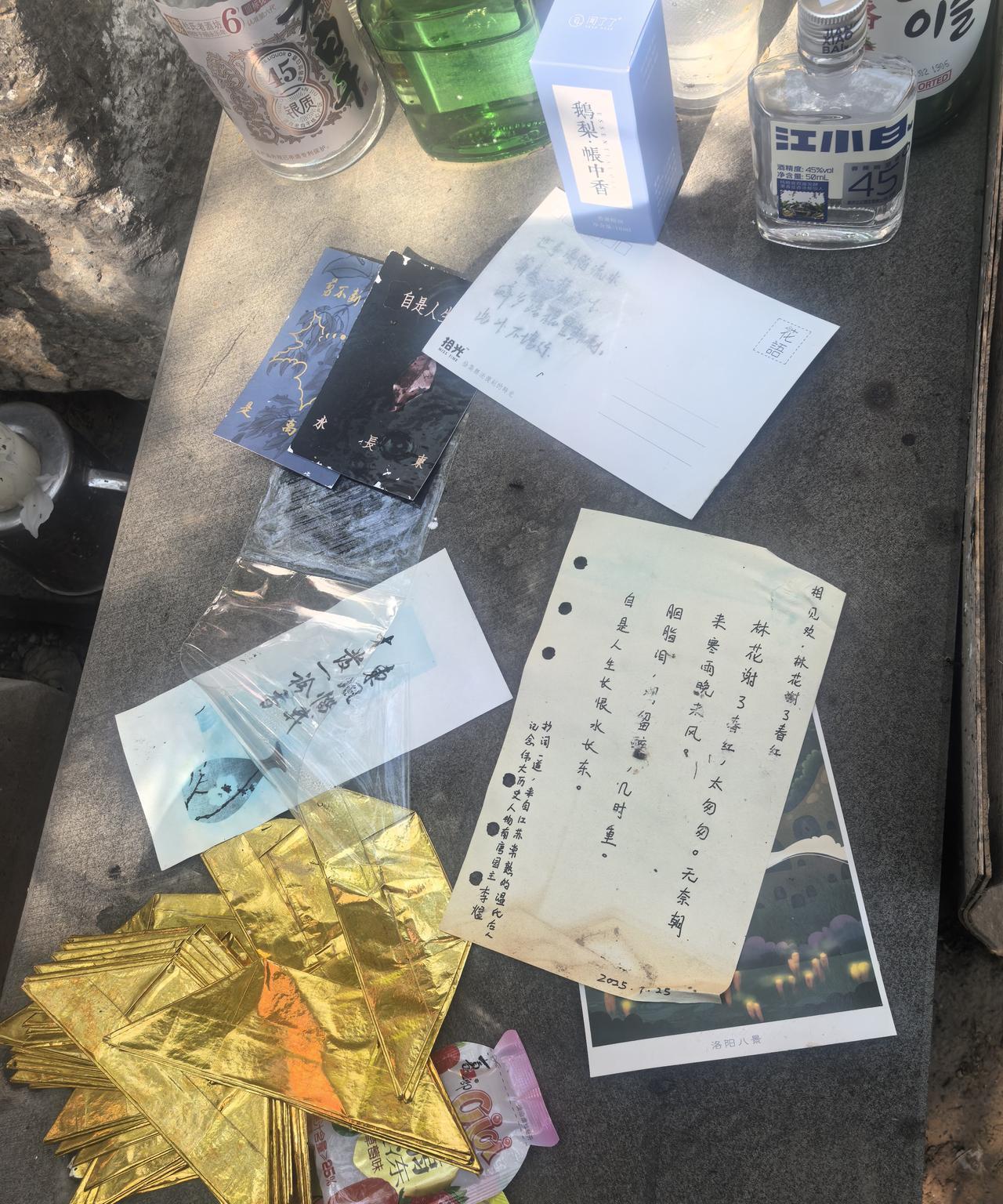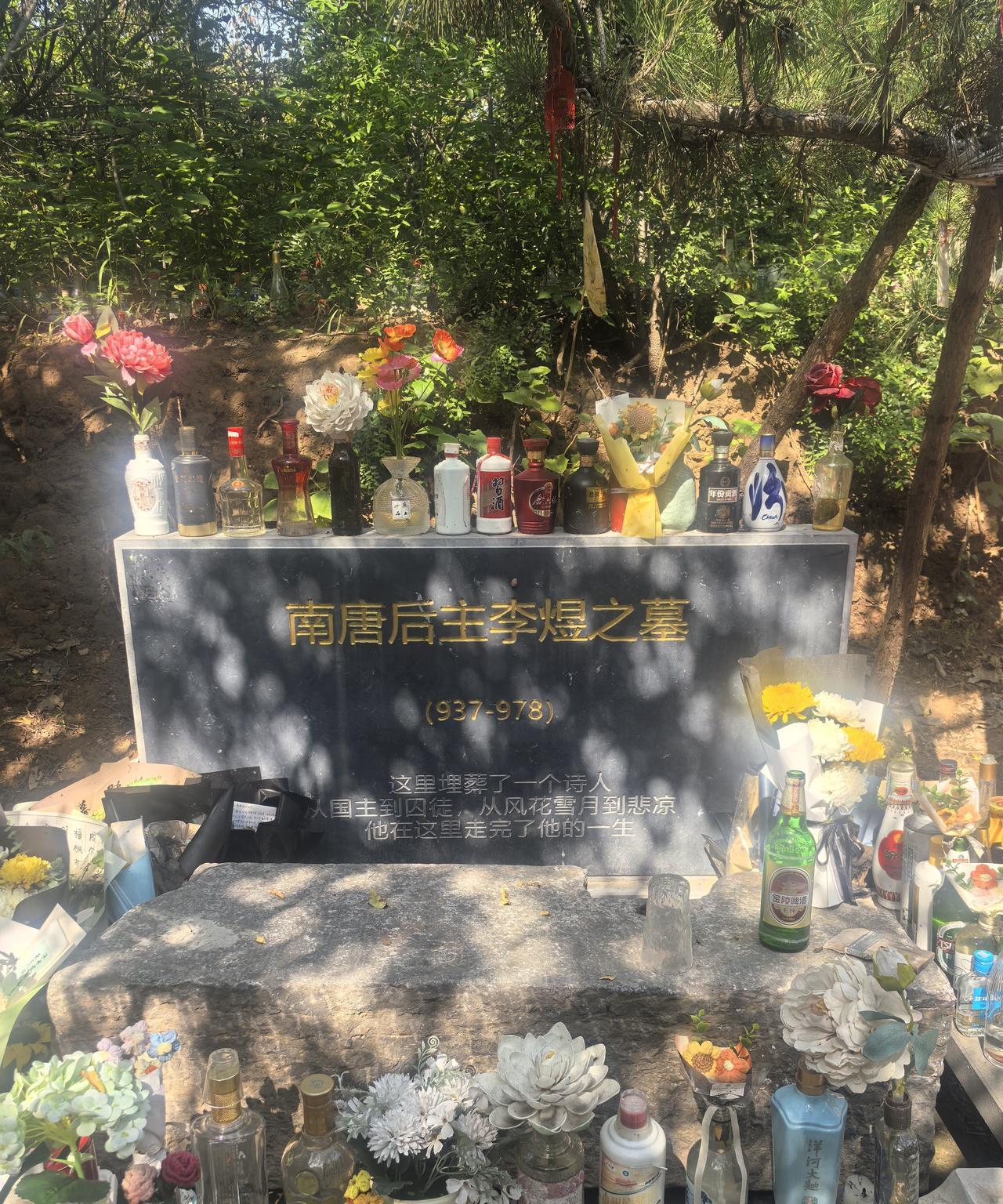 来洛阳玩了几天,今天偶有兴致来到了位于北郊外的李煜墓,顺着地图,走入小道,踏入一片密林,看到了在角落里的李煜墓碑,已经没有坟冢了,只有一块横碑,估计还是李煜粉丝自发修筑的,洛阳的帝王墓,名人墓太多了,以至于这个悲凉的南唐词帝,竟然落的如此凄凉,没有围墙圈住,没有任何附属建筑,没有陈列馆,甚至没有一个介绍。不过好在有一帮粉丝没有忘记他,很多人拿了一些酒来祭奠他,不乏名酒茅台,青花汾,习酒等等,也有很多人给李煜留言,诉说他的词里的悲凉,还有人把金陵啤酒拿过来,把南唐故土拿过来以慰先灵。