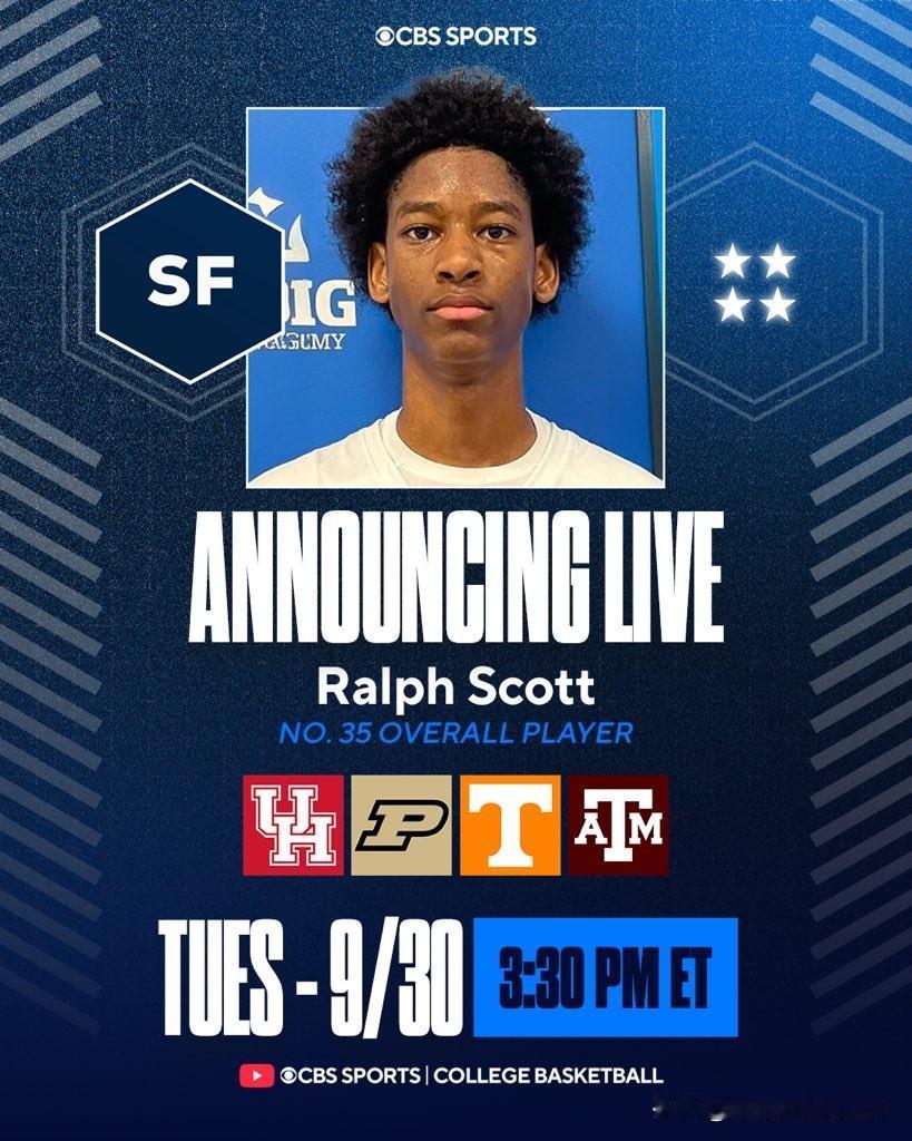 TOP40四星小前锋RalphScott宣布承诺NCAA男篮田纳西大学,来自