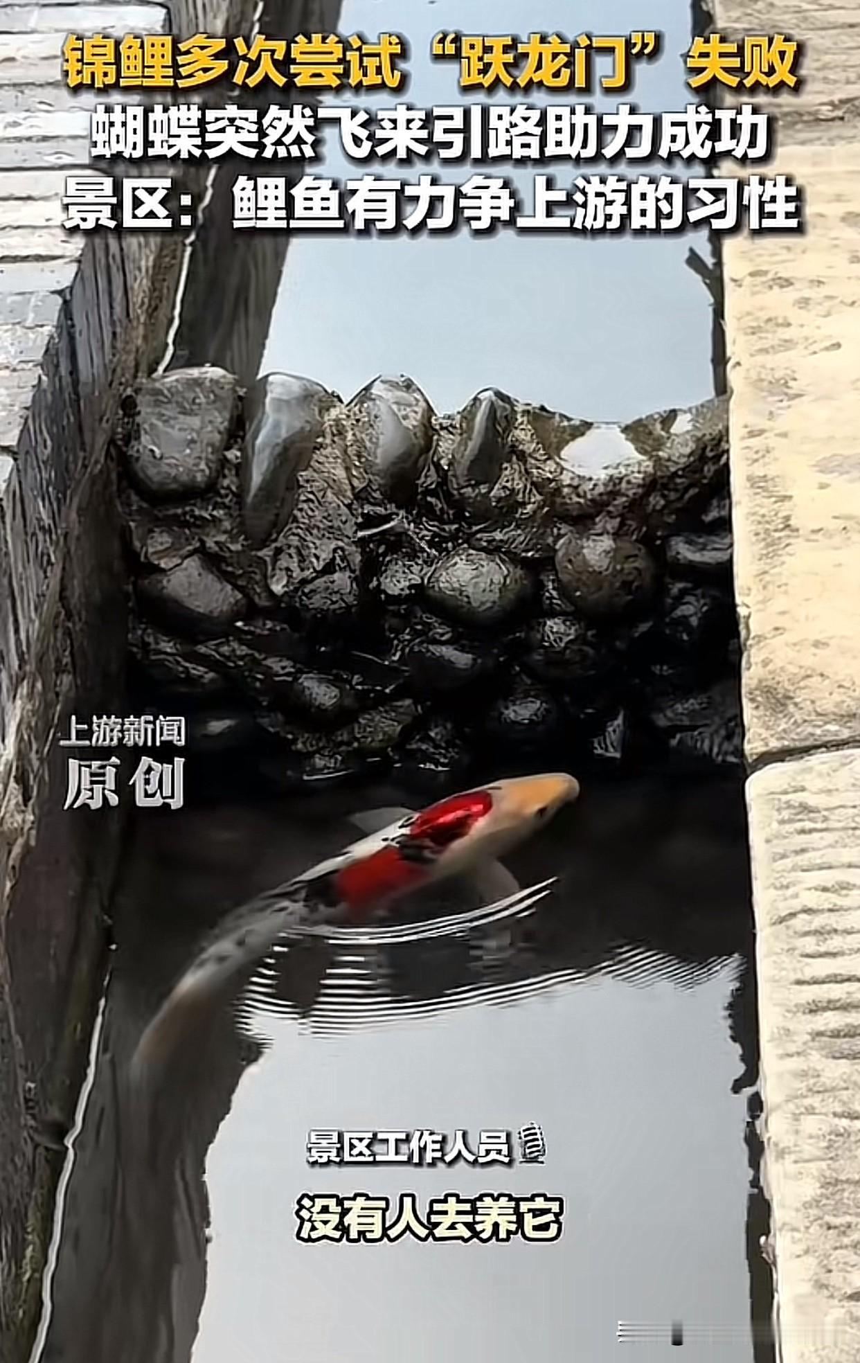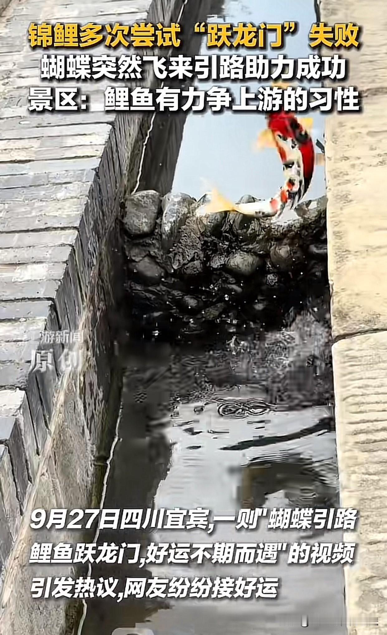 太神奇了! 你看过蝴蝶帮鲤鱼指路吗? 四川宜宾景区里真有这么神奇的事!一条鲤鱼跳不过石坎,试了好几次都失败,累得停下来休息。这时候,一只蝴蝶飞过来,先是在它头顶转了几圈,然后稳稳停在了对岸。 你说神奇不?那条鲤鱼就像突然懂了似的,用尽全力纵身一跃,这次居然成功了! 网友们都被震撼到了,有人说这蝴蝶就是专门来指路的。还有位有才的网友写了句诗:“蝶翼轻指引天途”,特别贴切。 说实话,我们每个人都像这条鲤鱼,努力了很久却一次次失败。但往往只需要一个小小的提示、一个偶然的机会,就能突破困境。我觉得这只蝴蝶就像生活中那些不经意的帮助:可能是朋友随口的一句话,陌生人的一个善意举动,或是自己突然想通的一个瞬间。 这件事最打动我的是,不同生命之间竟然能有这样的默契。其实我们遇到困难时,不妨学会寻找帮助,也要坚持不放弃。相信吗,就在你快撑不住的时候,转机可能正在来的路上! 希望我们都能遇到生命中的“蝴蝶”,然后抓住机会,实现自己的飞跃!