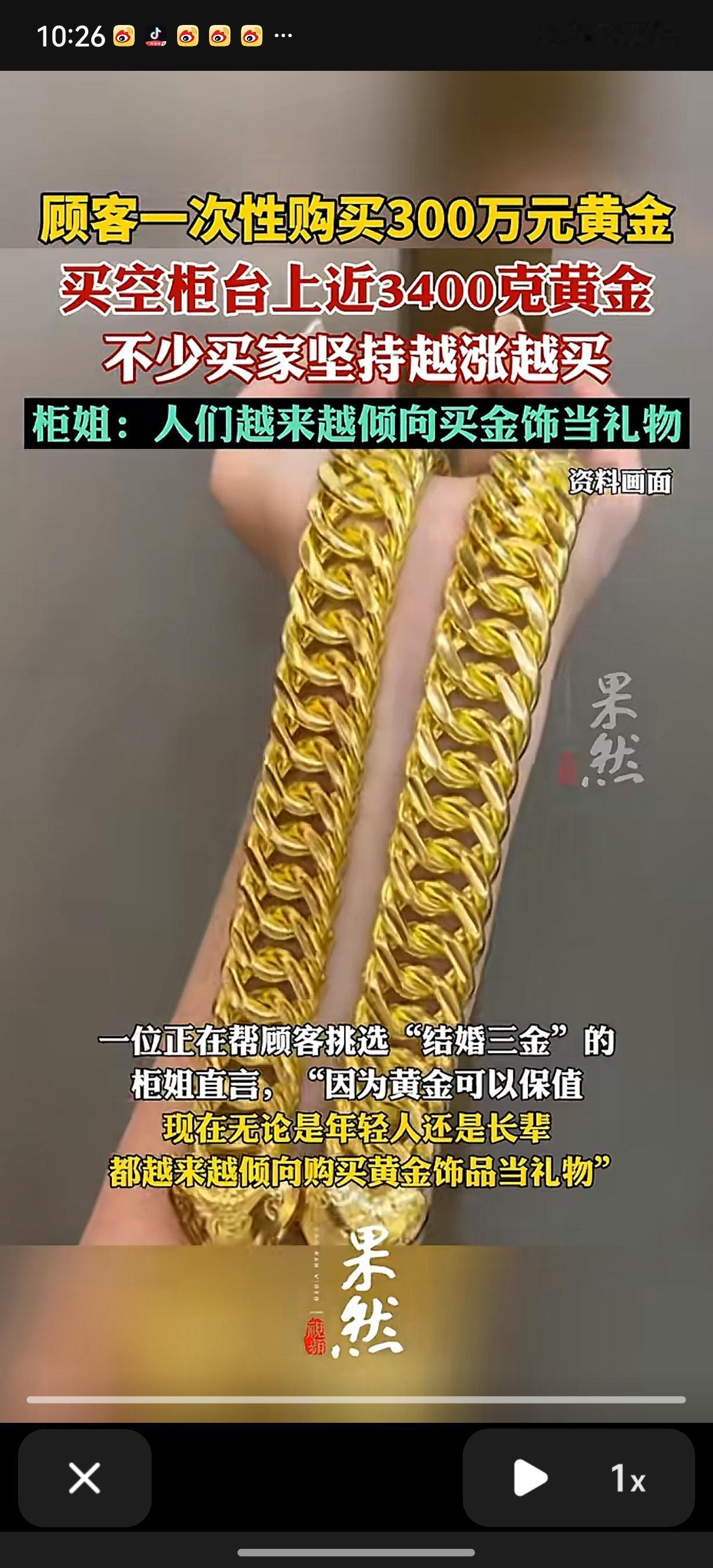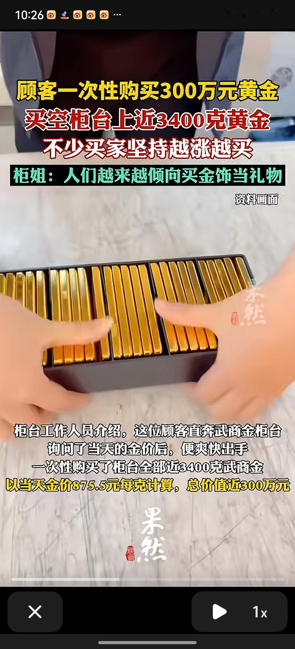 国庆节,你会去购置黄金吗? 昨日,有顾客前往武商榷金街,一出手便买了武商金柜中价值三百万的黄金,将整个柜台的黄金一扫而空。 此时,金价为每克875.5元,这位顾客购入了3400克黄金。 顾客的举动令柜员惊愕不已,随即又欣喜若狂,赶紧打包黄金。 顾客向柜员表示:越涨越买,买涨不买跌,且不怕金价下跌,因为黄金具有保值功能。 这一理念与当初买房如出一辙。 最早一批买房的人赚得盆满钵满,难道买黄金和买房是同样的道理吗? 如今,甚至有些长辈在过年时送给晚辈的压岁钱,也被黄金取代,变成了“压岁黄金”。 当下的你,会去购买黄金吗?黄金真的只涨不跌吗? 来源:齐鲁晚报果然视频