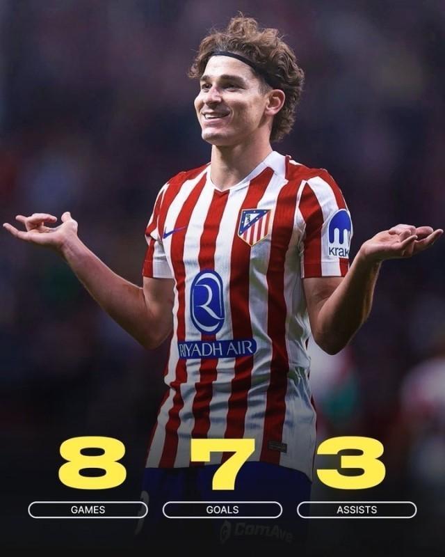 马竞5比1法兰克福,连续2场打入5球,近3场打入13球,阿尔瓦雷斯居功至伟。9月21日1比1客平马洛卡,小蜘蛛第63分钟被瑟洛特换下,大为不满的他爆了一句“每次都是我!(前5场西甲4次被换下)”,而9分钟后瑟洛特染红下场。正是在这场马黛茶杯里的风波之后,小蜘蛛彻底爆发:对巴列卡诺帽子戏法(3比2),对皇马梅开二度(5比2),对法兰克福1球2助(5比1),近3场比赛贡献6球2助攻!这3个主场他都打足了90分钟,对皇马和法兰克福只是第90分钟才被换下接受掌声。