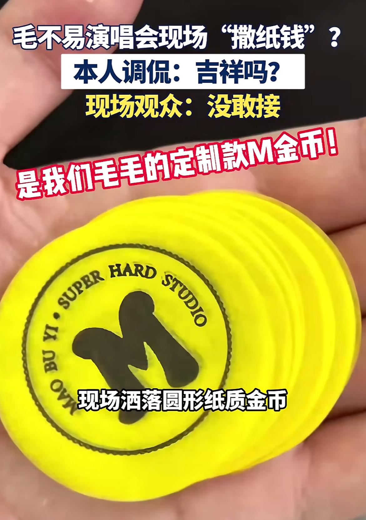 向粉丝撒冥币?这操作真的太败好感, 哪来的“创意”敢这么胡闹! 毛不易演唱会现场撒纸铜钱, 美其名曰“道具”,可这东西明眼人一看就像冥币,漫天飘着配上粉丝狂笑,真的让人心里发堵。粉丝里大多是年轻人,可能没多想只觉得热闹,但换作长辈,绝对会觉得不尊重人——毕竟这东西从来都是和晦气挂钩的,哪有拿这个当玩笑的? 别拿“戏场无禁忌”当借口,娱乐也得有底线。演唱会是传递快乐的地方,不是挑战大众认知和习俗的场合,这种打擦边球的“创意”,根本不是有趣,是没分寸。 你觉得这种“道具”该被接受吗?要是换成你在现场,看到这一幕会觉得好玩还是不舒服?